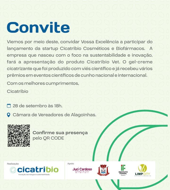 No dia 28 de setembro, às 18h, na Câmara de Vereadores de Alagoinhas (BA), acontecerá o coquetel de lançamento da 1ª startup do IFBaiano: Cicatribio Cosméticos e biofármacos. Na ocasião será apresentado o primeiro produto, CicatribioVet, o gel-creme cicatrizante que é um produto inovador, sustentável e tecnológico para mercado veterinário, ao qual foi idealizado por docentes e discentes a partir de um projeto de pesquisa científica do Instituto Federal Baiano Campus Catu.