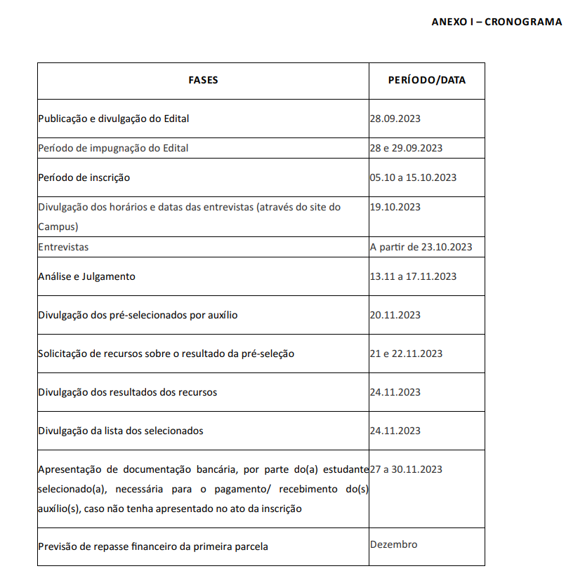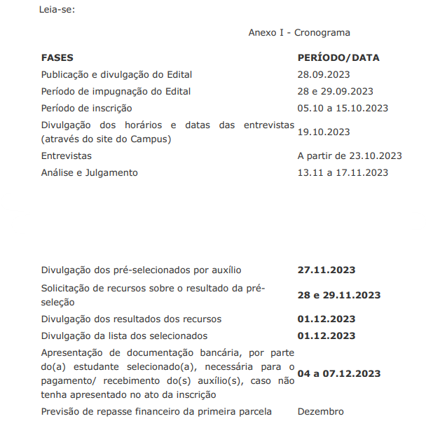 Apresentação de documentação bancária, por parte do(a) estudante selecionado(a), necessária para o pagamento/ recebimento do(s) auxílio(s), caso não tenha apresentado no ato da inscrição04 a 07.12.2023