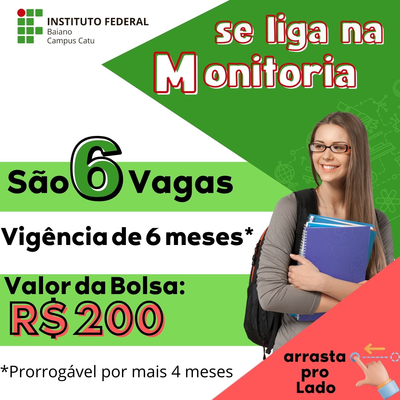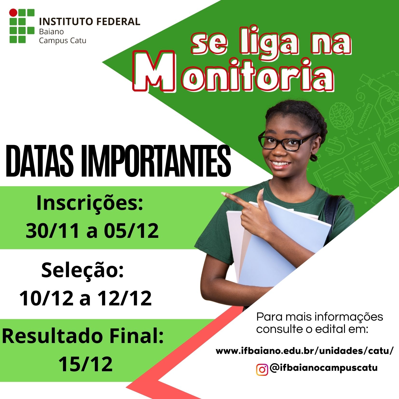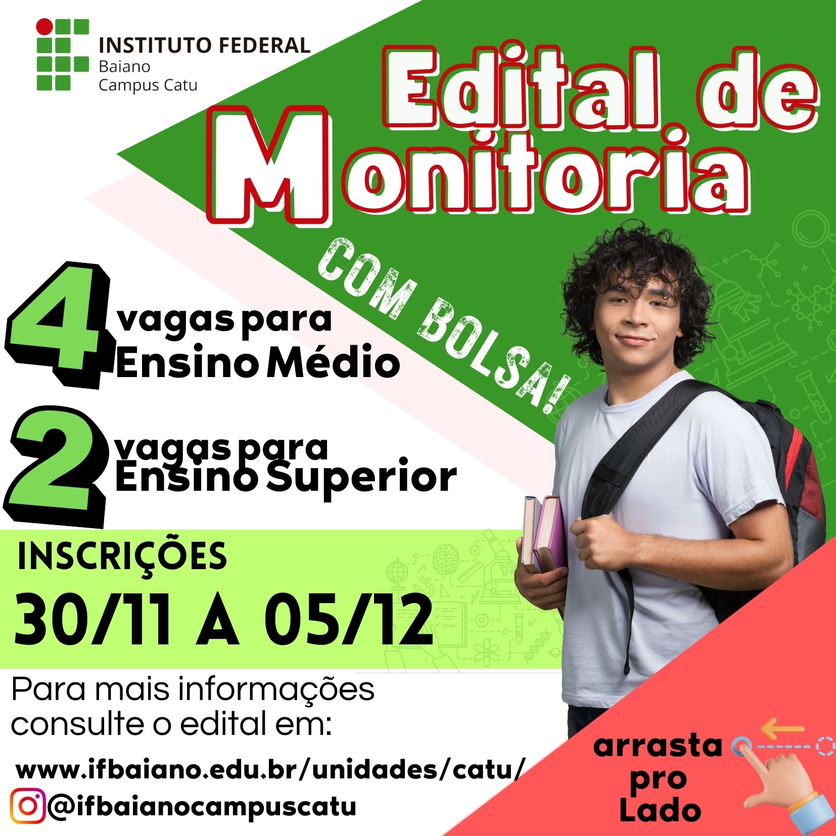 A DIRETORA-GERAL DO INSTITUTO FEDERAL DE EDUCAÇÃO, CIÊNCIA E TECNOLOGIA BAIANO- IF BAIANO ,CAMPUS CATU no uso da competência delegada pela Portaria nº 276, de 18 de março de 2022, publicada no Diário Oficial da União de 21 de março de 2022, e de acordo com as disposições contidas na Lei nº 11.892, de 29/12/2008, e na Lei nº 8.112, de 11/12/1990, torna pública a abertura das inscrições do Processo Seletivo para Concessão de Bolsas de Monitoria para os Cursos da Educação Profissional Técnica de Nível Médio e de Graduação.