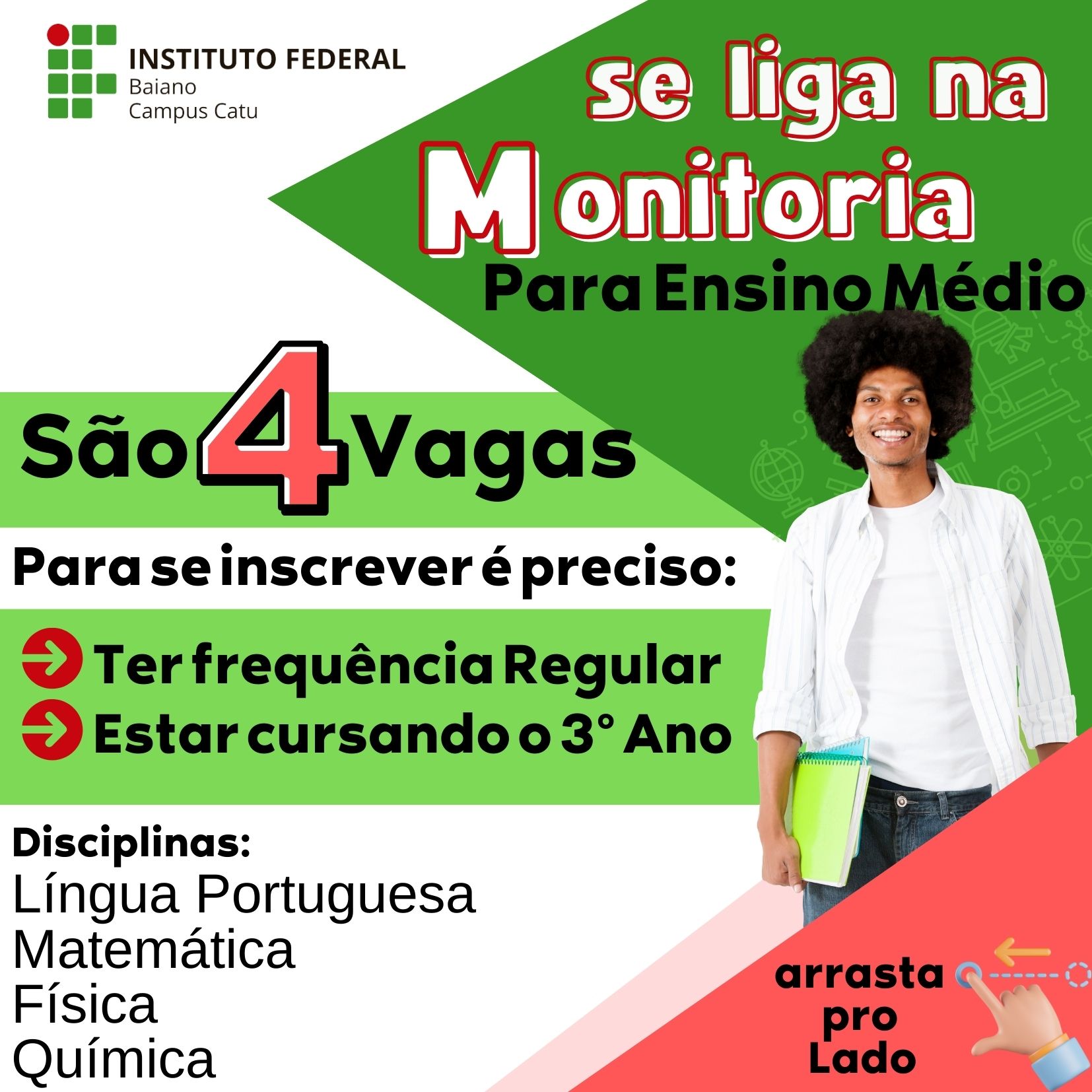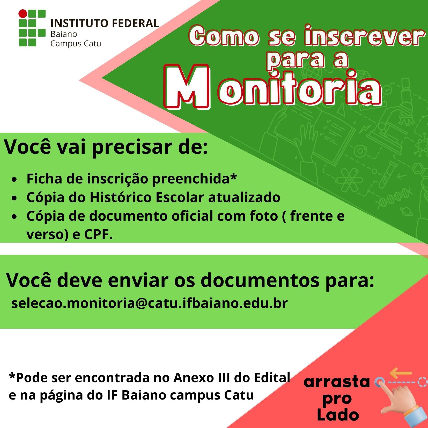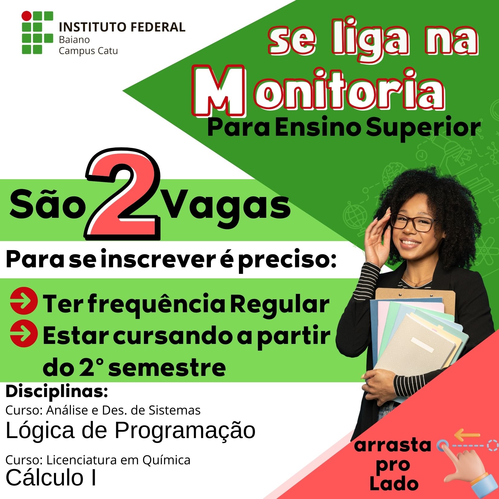 A DIRETORA-GERAL DO INSTITUTO FEDERAL DE EDUCAÇÃO, CIÊNCIA E TECNOLOGIA BAIANO- IF BAIANO ,CAMPUS CATU no uso da competência delegada pela Portaria nº 276, de 18 de março de 2022, publicada no Diário Oficial da União de 21 de março de 2022, e de acordo com as disposições contidas na Lei nº 11.892, de 29/12/2008, e na Lei nº 8.112, de 11/12/1990, torna pública a abertura das inscrições do Processo Seletivo para Concessão de Bolsas de Monitoria para os Cursos da Educação Profissional Técnica de Nível Médio e de Graduação.