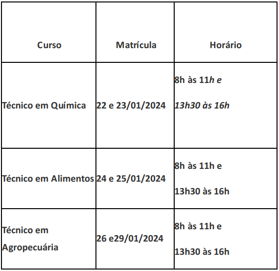 O DIRETOR-GERAL SUBSTITUTO DO INSTITUTO FEDERAL DE EDUCAÇÃO, CIÊNCIA E TECNOLOGIA BAIANO – CAMPUS CATU, no uso das suas atribuições legais, conferidas pela Portaria n. 54 de 11 de janeiro de 2023, publicada no DOU de 12/01/2023, e de acordo com as disposições contidas na Lei nº 11.892, de 29/12/2008, e na Lei nº 8.112, de 11/12/1990, convoca os(as) candidatos(as) aprovados (as) no processo para ingresso de estudantes em 2024, Edital nº 34-2023, Curso Técnico Integrado ao Ensino Médio em Agropecuária , Alimentos e Química, na modalidade Presencial , para matrícula.