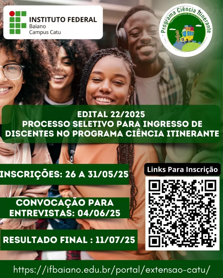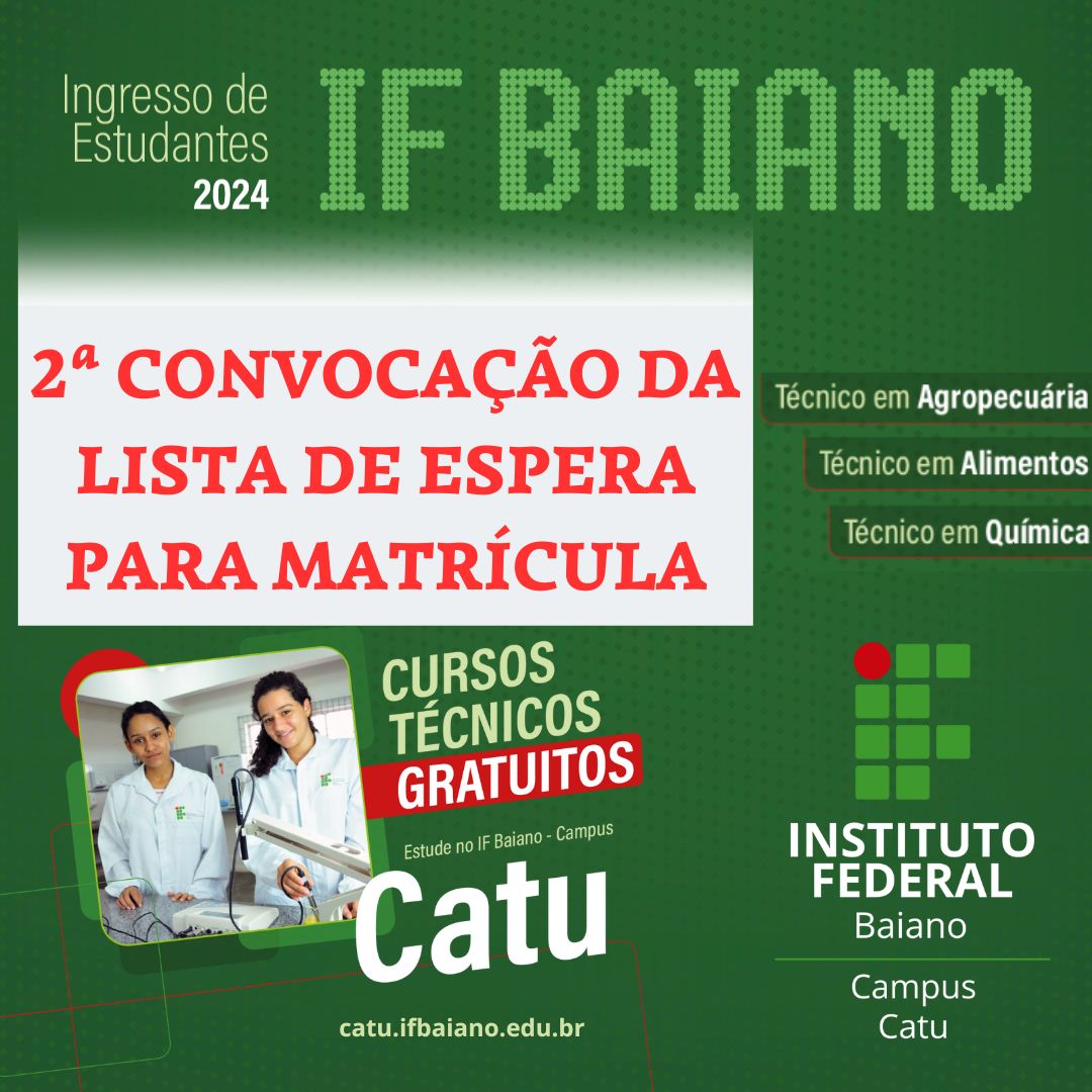 BAIANO – IF BAIANO, CAMPUS CATU no uso da competência delegada pela Portaria nº 276, de 18 de março de 2022, publicada no Diário Oficial da União de 21 de março de 2022, e de acordo com as disposições contidas na Lei nº 11.892, de 29/12/2008, e na Lei nº 8.112, de 11/12/1990, divulga a 1º Convocação da Lista de Espera para Matrícula do Processo Seletivo para ingresso de estudantes nos Cursos da Educação Profissional Técnica de Nível Médio na Forma Integrada ao Ensino Médio – Modalidade Presencial. E as orientações para a matrícula