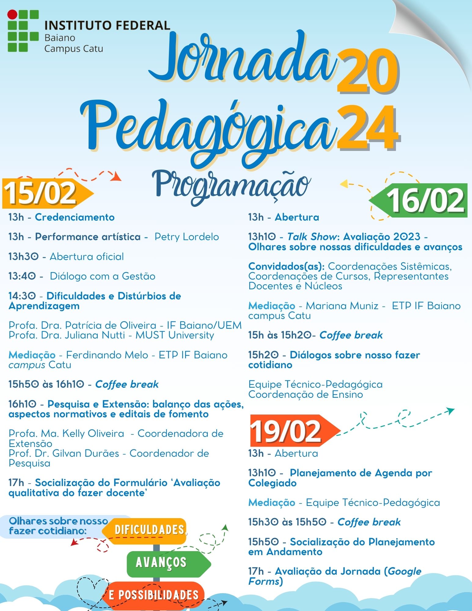 A jornada pedagógica 2024.1 será realizada nos dias 15, 16 e 19 de fevereiro, no turno vespertino, com a seguinte temática: Olhares sobre nosso fazer cotidiano: dificuldades, avanços e possibilidades. O evento conta com uma programação que contempla temáticas do dia a dia em sala de aula, espaço para debate, avaliação e, especialmente, o planejamento do ano letivo. Será um momento enriquecedor para professores, técnicos administrativo e corpo gestor do nosso campus.