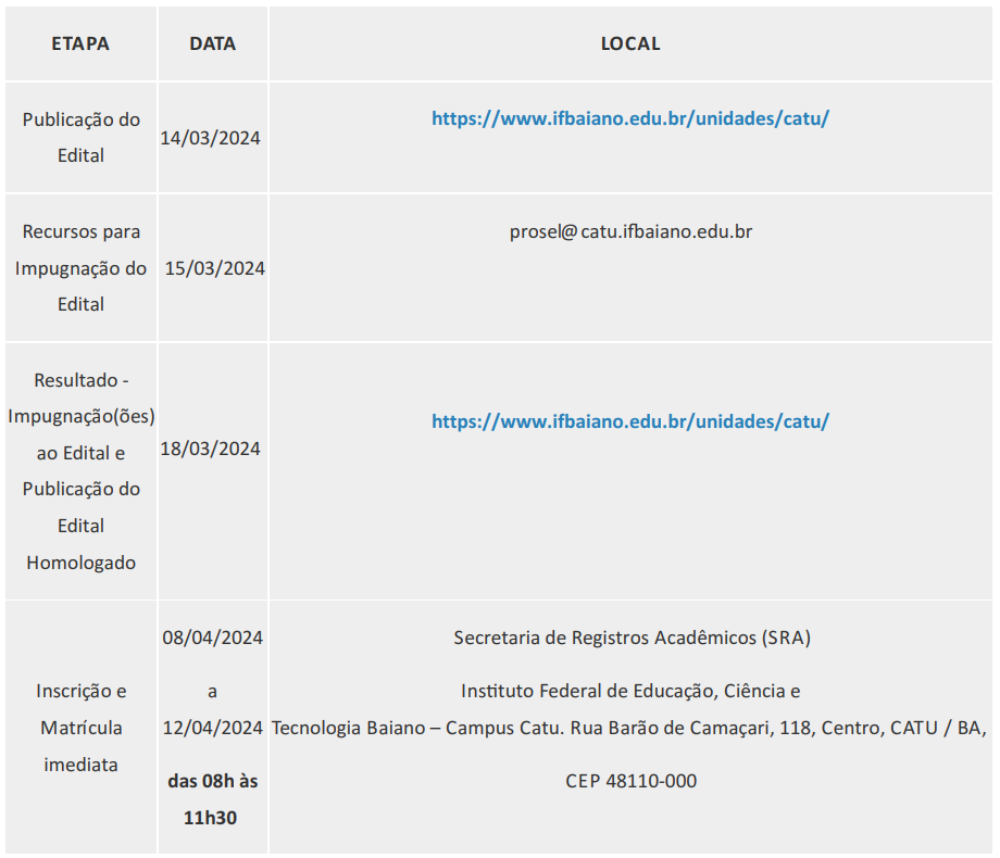 Instituto Federal de Educação, Ciência e Tecnologia Baiano – Campus Catu. Rua Barão de Camaçari, 118, Centro, CATU / BA, CEP 48110-000