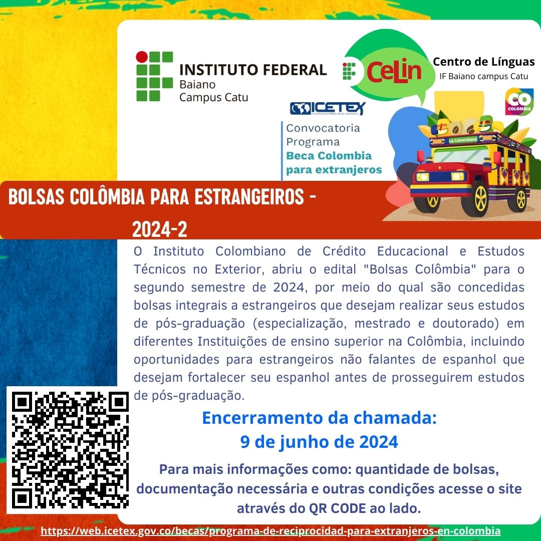 O Instituto Colombiano de Crédito Educacional e Estudos Técnicos no Exterior, abriu o edital “Bolsas Colômbia” para o segundo semestre de 2024, por meio do qual são concedidas bolsas integrais a estrangeiros que desejam realizar seus estudos de pós-graduação (especialização, mestrado e doutorado) em diferentes Instituições de ensino superior na Colômbia, incluindo oportunidades para estrangeiros não falantes de espanhol que desejam fortalecer seu espanhol antes de prosseguirem estudos de pós-graduação.