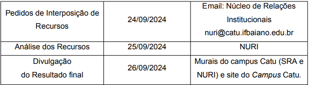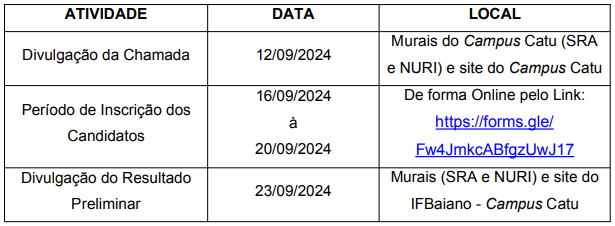 A Diretora Geral do Instituto Federal de Educação, Ciência e Tecnologia Baiano, do campus Catu, no uso de suas atribuições legais e estatutárias, torna público que estarão abertas, de acordo com o que estabelece o presente Edital, inscrições para oferta de estágio e formação de cadastro de reserva do estágio curricular obrigatório nas dependências deste Instituto, sem remuneração para os estudantes do Cursos Técnicos do Campus Catu, conforme quadro a seguir: