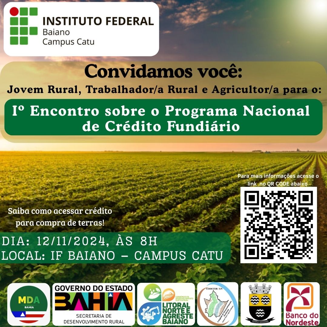 Quer saber como conquistar sua terra própria e investir no seu futuro no campo? O IF Baiano – Campus Catu te convida para um evento especial sobre o Programa Nacional de Crédito Fundiário! 🧑🏽🌾🌾