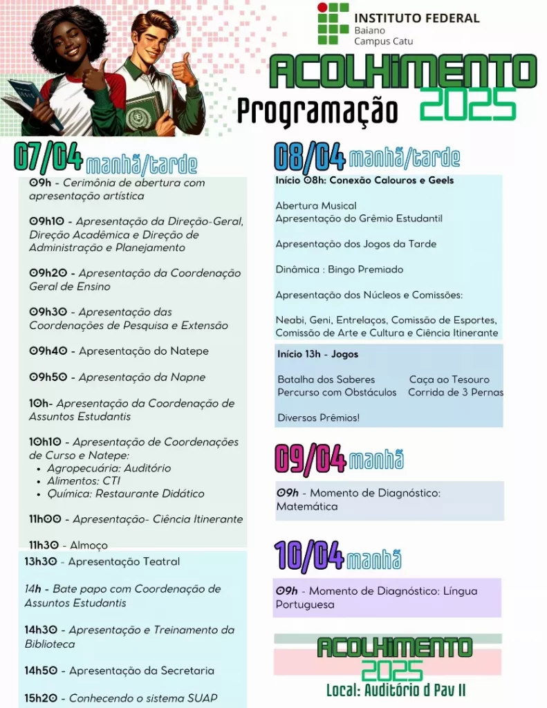 📅 07 e 08 de abril – Uma programação especial para você conhecer nossa instituição, professores, coordenadores e todas as oportunidades que o IF Baiano tem a oferecer! 🎭🎶📚