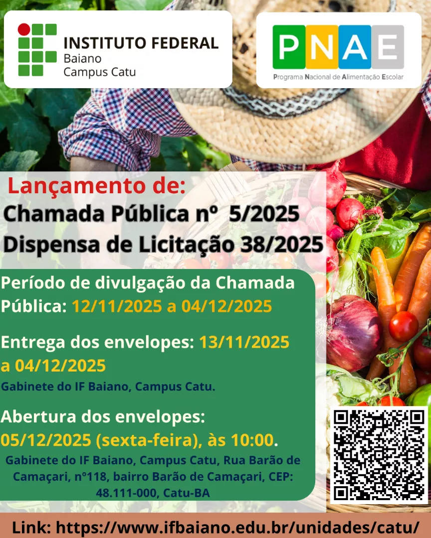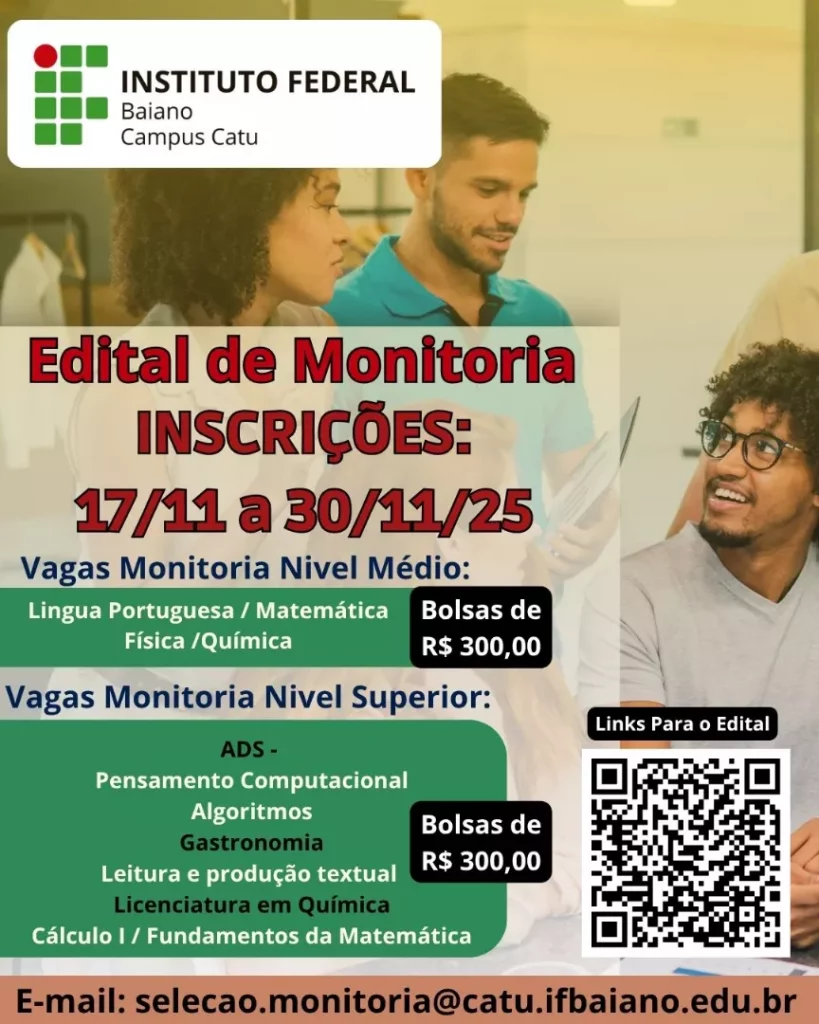 A DIRETORA-GERAL DO INSTITUTO FEDERAL DE EDUCAÇÃO, CIÊNCIA E TECNOLOGIA BAIANO – IF BAIANO ,CAMPUS CATU no uso da competência delegada pela Portaria nº 276, de 18 de março de 2022, publicada no Diário Oficial da União de 21 de março de 2022, e de acordo com as disposições contidas na Lei nº 11.892, de 29/12/2008, e na Lei nº 8.112, de 11/12/1990, torna pública a abertura das inscrições do Processo Seletivo para Concessão de Bolsas de Monitoria para os Cursos da Educação Profissional Técnica de Nível Médio e de Graduação.