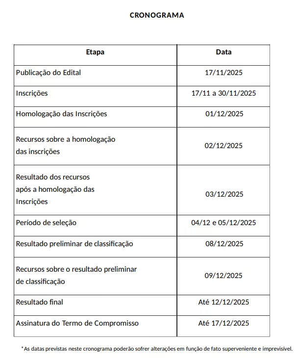As inscrições deverão ser realizadas no período de 17/11/2025 a 30/11/2025, por meio de correspondência eletrônica enviada ao endereço selecao.monitoria@catu.ifbaiano.edu.br, viabilizando-se a inscrição dos(as) estudantes;