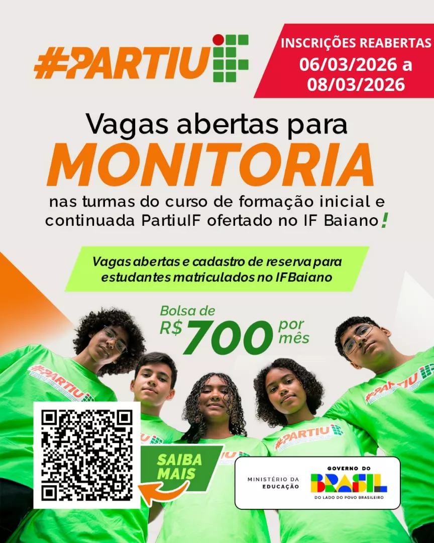 O IF Baiano está com inscrições abertas até 28 de fevereiro para o Programa Partiu IF 💚✨ São 560 vagas em 14 campi para um curso gratuito de 320 horas, voltado à recomposição de aprendizagens e ao fortalecimento das competências de estudantes da escola pública que sonham em chegar mais longe.