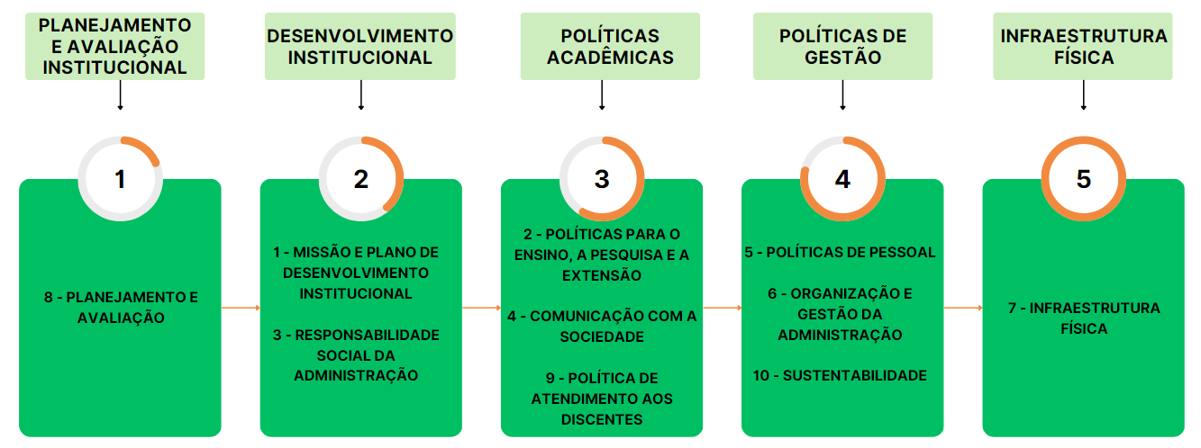 A comissão avalia aspectos estruturados em cinco eixos e dez dimensões, por meio de questionários, rodas de conversa, entrevistas e visitas in loco, destinados a comunidade acadêmica e a comunidade local: