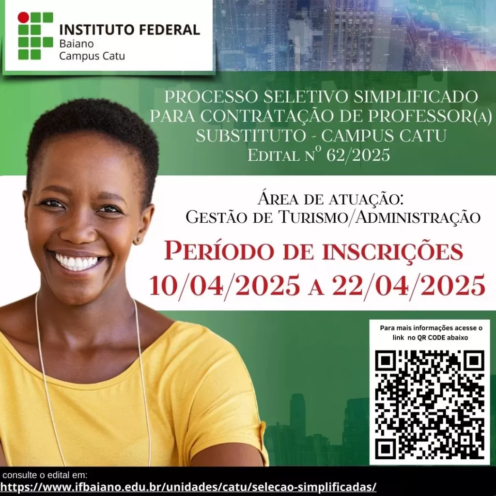 📰 Edital nº 62/2025 – Professor Substituto Área de Gestão de Turismo Administração -Campus Catu