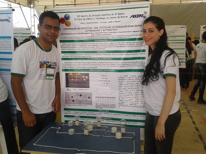 Nos dias 21 a 24 de outubro de 2013 alunos do IF Baiano campus Governador Mangabeira participaram da III Mostra de Iniciação Científica (III MIC) e II Feira de Ciências e Tecnologia do município de Senhor do Bonfim e Território de Identidade do Piemonte do Norte do Itapicuru (II FECITEC-BONFIM). Dentre os alunos participantes, Edson Rocha N. Júnior e Luisa S. França apresentaram o trabalho intitulado Construção de Circuitos: Uma atividade interdisciplinar entre eletricidade e Matemática. Tendo em vista a dificuldade de aprendizagem dos alunos em circuitos elétricos e Álgebra de Boole, foram realizadas atividades teóricas e práticas buscando melhorar o entendimento nestes conteúdos. Os alunos construíram circuitos elétricos para a verificação e análise de: tensão, corrente, associação de resistências, potência, circuitos em série, circuito em paralelo, circuito misto, noções de curto-circuito, função Booleana, simplificações de funções Booleanas e tabela verdade. Por meio destes circuitos os alunos comprovaram experimentalmente o que haviam estudado na teoria, elaborando um relatório envolvendo cálculos, análises, simplificações e tabelas. O trabalho foi orientado pelos professores Agamenon Xavier e Roberto Souza.