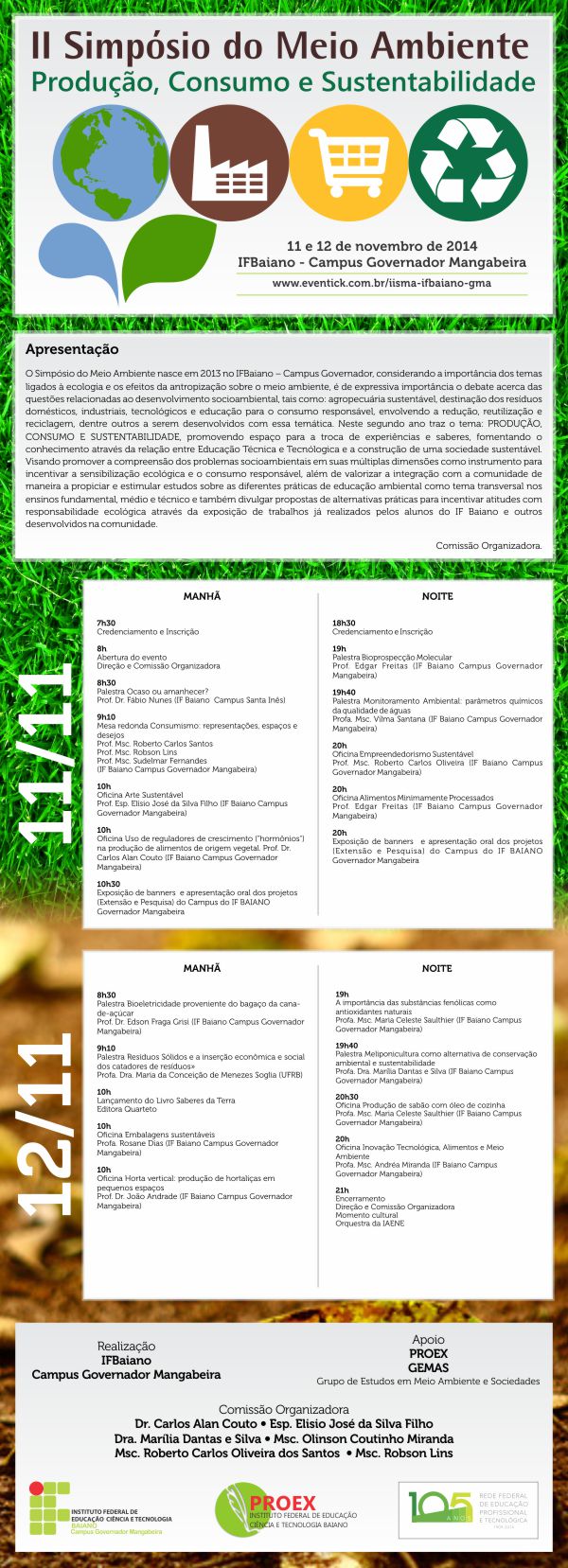 Nos dias 11 e 12 de novembro, acontecerá o II Simpósio do Meio Ambiente no Campus Governador Mangabeira. Com o tema “Produção, Consumo e Sustentabilidade”, o encontro “permitirá um espaço para a troca de experiências e saberes, fomentando o conhecimento através da relação entre Educação Técnica e Tecnológica que poderá promover a construção de uma sociedade sustentável e justa”, explica Marília Dantas, organizadora do evento.