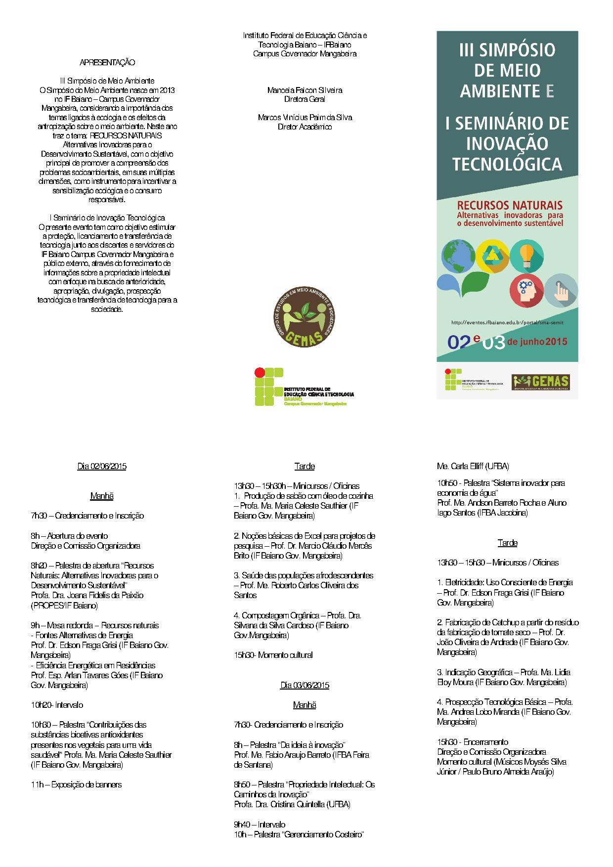 O Campus Governador Mangabeira realizará nos dias 02 e 03 de Junho de 2015 o III Simpósio de Meio Ambiente e I Seminário de Inovação Tecnológica.