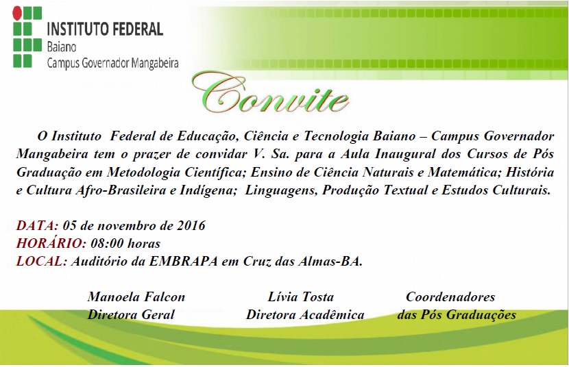 Reitoria: Rua do Rouxinol, nº 115, Imbuí, Salvador-BA. CEP: 41720-052. CNPJ: 10.724.903/0001-79 Telefone: (71) 3186-0001 | E-mail: gabinete@ifbaiano.edu.br