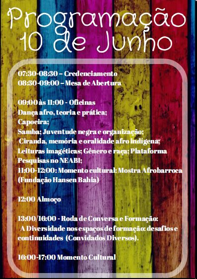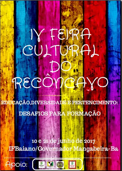 A 4ª Feira Cultural do Recôncavo que acontecerá nos dias 10 e 21/06/2017 abordará o tema Educação, Diversidade e Pertencimento: Desafios para Formação. O público-alvo do evento são Servidores e discentes do IF Baiano, Funcionários Terceirizados e Comunidade de regiões circunvizinhas da cidade de Governador Mangabeira – Ba.