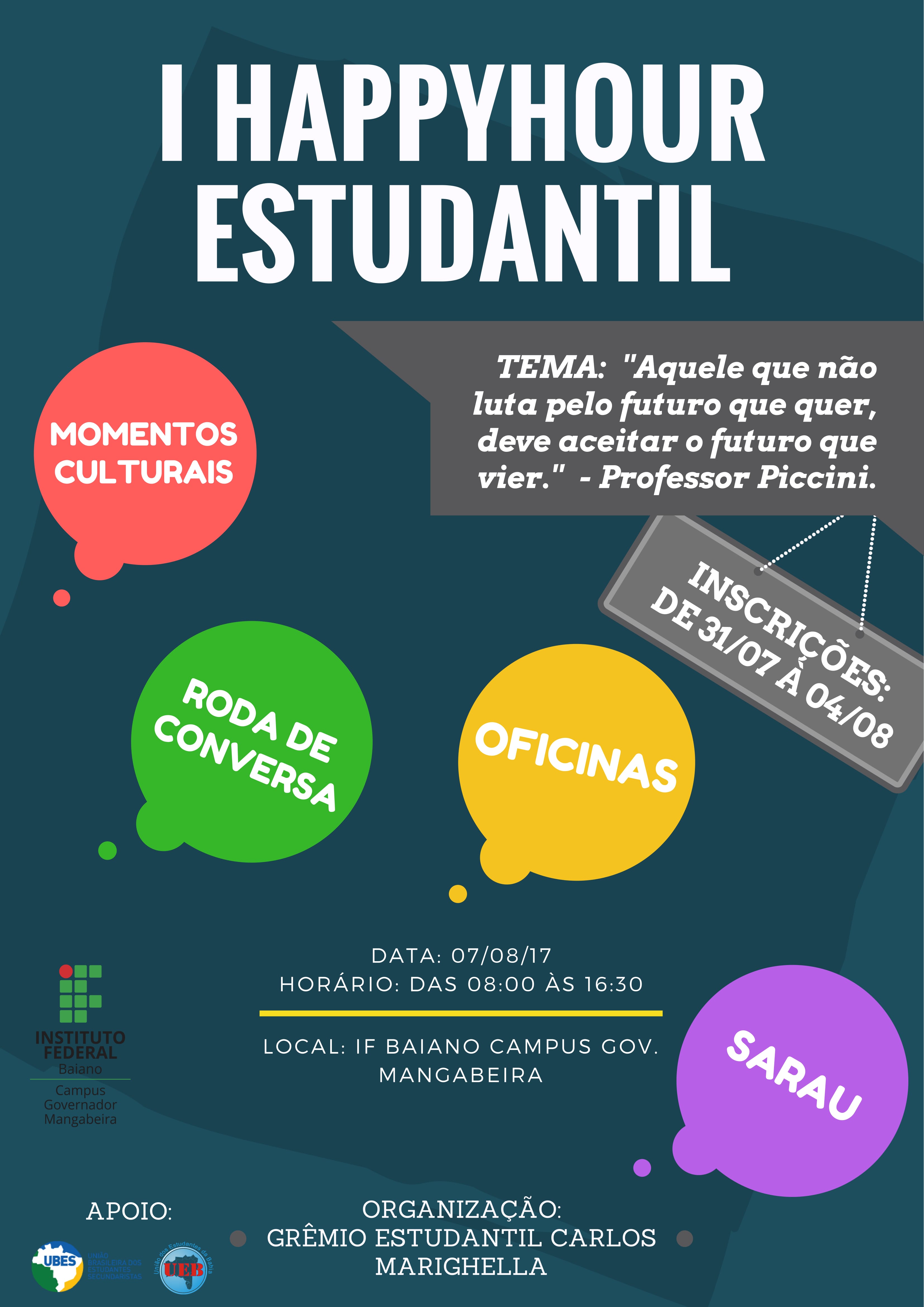 O I Happy Hour Estudantil é um evento formativo e comemorativo para os estudantes do IF Baiano Campus Governador Mangabeira/BA, realizado pelos estudantes para os estudantes.
