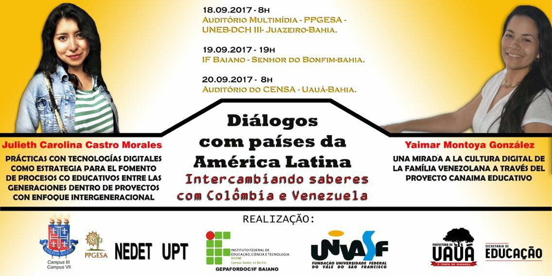 A Universidade do Estado da Bahia, Departamento de Educação de Senhor do Bonfim (Núcleo de Pesquisa e Extensão em Desenvolvimento Territorial-NEDET e Universidade para Todos-UPT); Departamento de Ciências Humanas de Juazeiro (Programa de Pós-Graduação em Educação, Cultura e Territórios Semiáridos-PPGESA), o IF Baiano – Campus Senhor do Bonfim (Colegiado da Licenciatura em Ciências da Computação, Grupo de Estudo e Pesquisa em (Auto)Formação Docente – GEPAFORDOC), a Universidade Federal do Vale do São Francisco – UNIVASF Campus Senhor do Bonfim (curso Geografia) e a Prefeitura de Uauá, através da Secretaria de Educação, estão promovendo nos dias 18, 19 e 20 de Setembro de 2017 o evento “Diálogos com Países da América Latina: intercambiando saberes com a Colômbia e Venezuela.