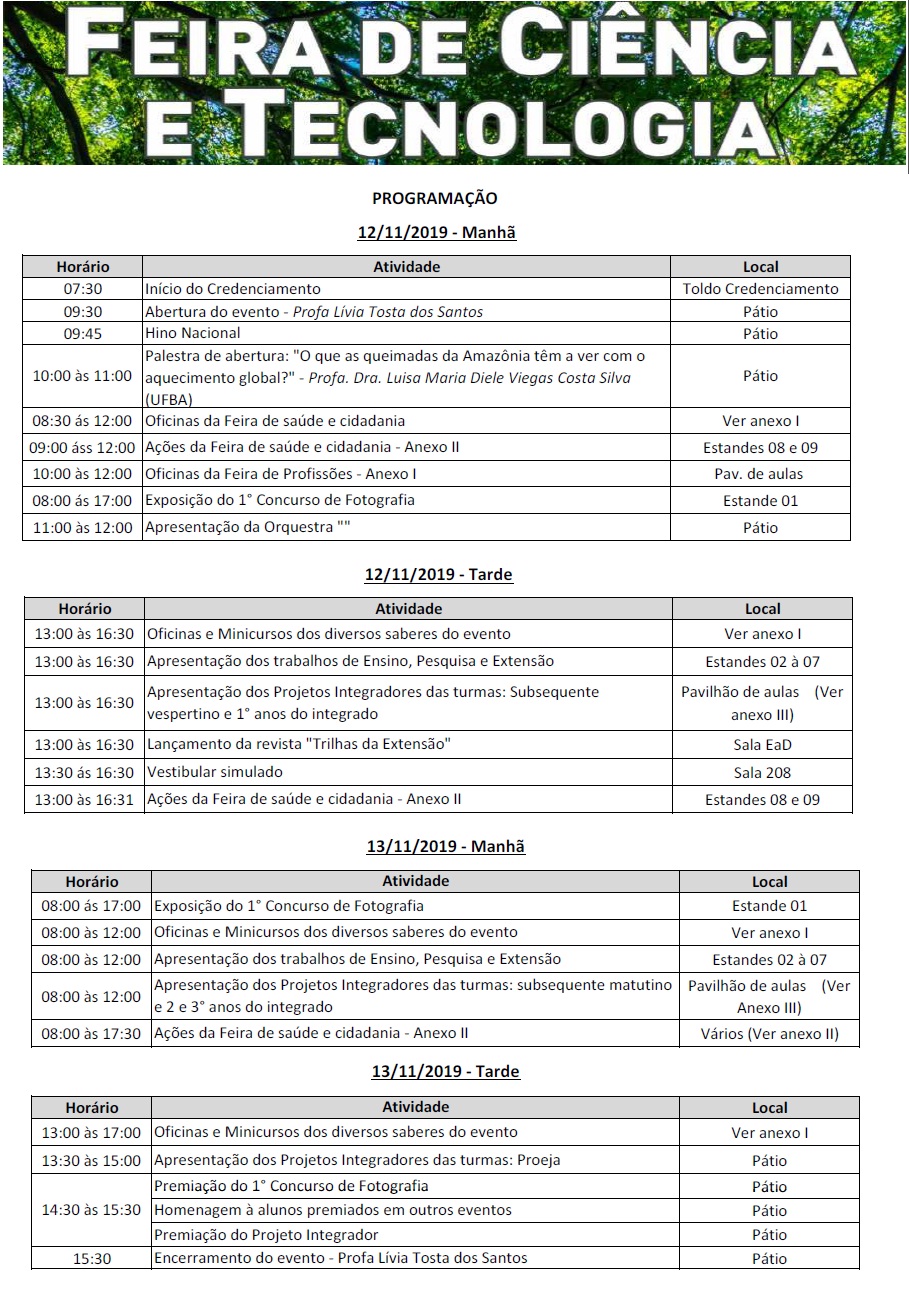 No IF Baiano Campus Governador Mangabeira a SNCT 2019 ocorrerá no período de 12 e 13/11/2019 e concomitante a Semana de Ciência e Tecnologia, também acontecerá: O VI Simpósio de Meio Ambiente, a I Feira de Saúde e Cidadania, a I Mostra de Profissões e a Mostra dos Projetos Integradores dos Cursos Técnico Integrados do IFBaiano – Governador Mangabeira.