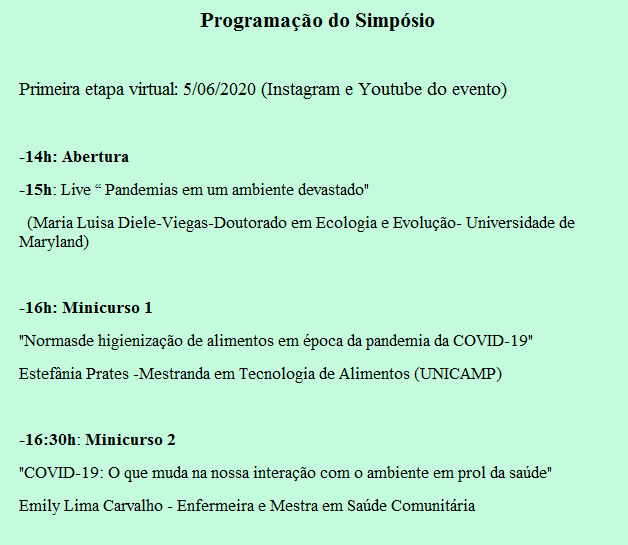 Devido a situação de emergência planetária causada pelo caos econômico e socioambiental que levaram a crises cada vez mais graves, inclusive a Pandemia da COVID-19, este ano teremos encontros virtuais. O primeiro delesserá realizado dia 5/06, Dia do Meio Ambiente. Nesta etapa teremos a abertura as 14h,seguida de livee minicursos com convidados via Instagram do evento: