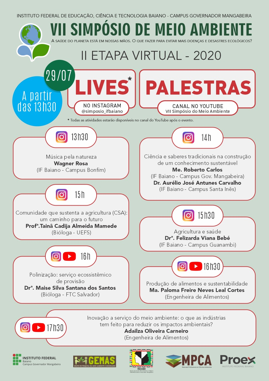 Convidamos a comunidade interna e externa a participar da II Etapa do VII Simpósio de Meio Ambiente 2020, do IFBAIANO de Governador Mangabeira . O evento dá continuidade ao VII SMA na modalidade virtual, que teve sua abertura com palestra e minicursos dia 05 de junho com o tema “A saúde do planeta Terra está em nossas mãos. O que fazer para prevenir mais doenças e desastres ecológicos?’’ A segunda etapa online será dia 29 de julho ,a partir das 13:30h com apresentação musical, seguida de lives e palestras com convidados via Instagram do evento: https://instagram.com/simposio_ifbaiano?igshid=uiqiz02ogr0m@ e You Tube: https://www.youtube.com/channel/UCXG4-q_0U0UvBY4vydNP9sw.