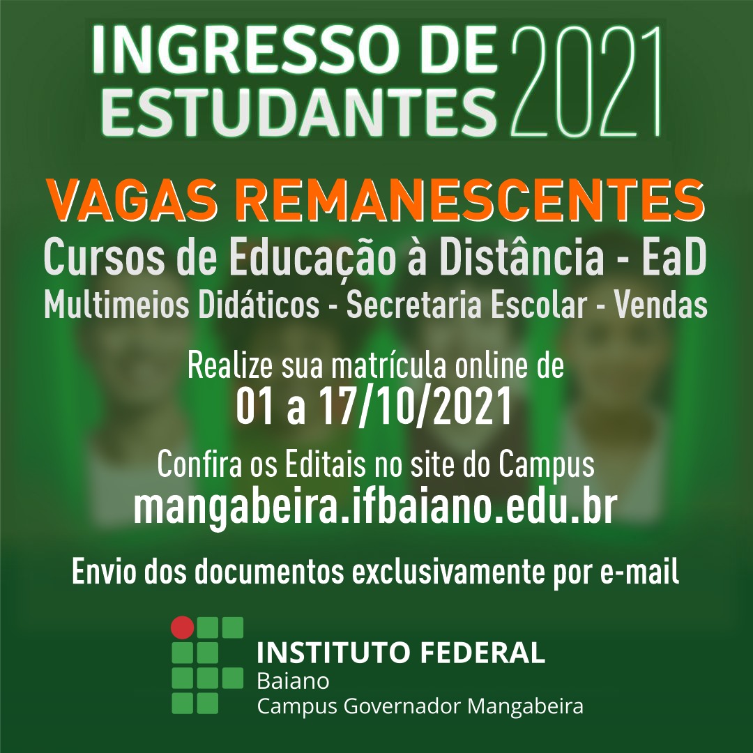 Estão abertas de 01 a 17 de outubro, as vagas remanescentes para os cursos subsequentes na modalidade de Educação à Distância [EaD] para os Polos de Governador Mangabeira e Santo Estêvão, nas áreas de Multimeios Didáticos, Secretaria Escolar e Técnico em Vendas. As vagas, horários e condições para ingresso podem ser consultadas no Edital 18/2021 disponível no site do Campus do IF Baiano Governador Mangabeira e o início das aulas está previsto para o dia 25 de outubro.