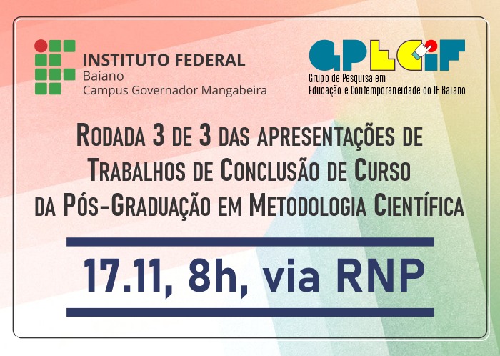 A Rodada de TCCs é um evento público das bancas de apresentação dos Artigos de Conclusão de Curso da Pós-Graduação lato sensu em Metodologia Científica do IF Baiano Campus Governador Mangabeira. Chegamos a terceira e última Rodada de 2021 com as apresentações dos Artigos dos discentes Bruna Lopes, Dalvaci Dias, Noel Reis, Jordânia Silva e Lorena Benevides. Todas as apresentações acontecem em formato on-line, no dia 17 de novembro, a partir das 8h, transmitidas pela plataforma RNP no endereço abaixo.
