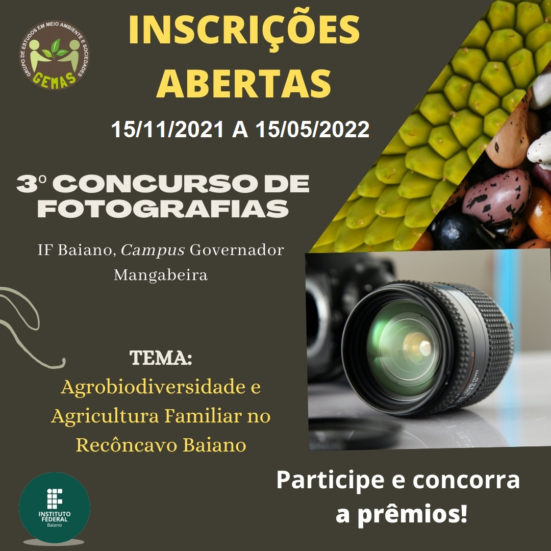 A comissão organizadora do 3° Concurso de Fotografia do IF Baiano, Campus Governador Mangabeira, informa que as inscrições foram prorrogadas até 15/05/2022.