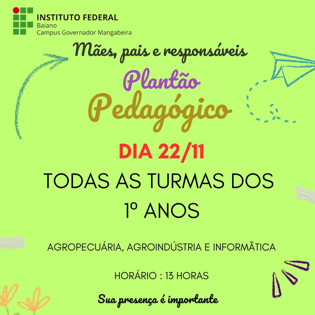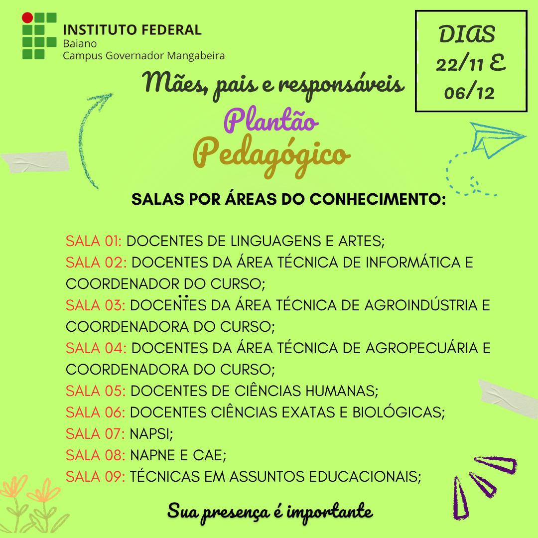 No dia 22/11 (quarta-feira) às 13h, o IF Baiano Campus Governador Mangabeira estará disponível para reunir os docentes, coordenadores, equipe multiprofissional, mães, pais e responsáveis, em diálogo sobre o andamento do período letivo, avaliações, êxito dos discentes, dentre outros temas pertinentes.