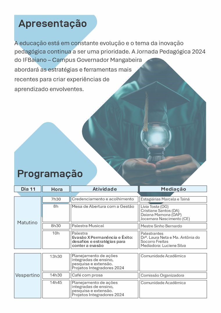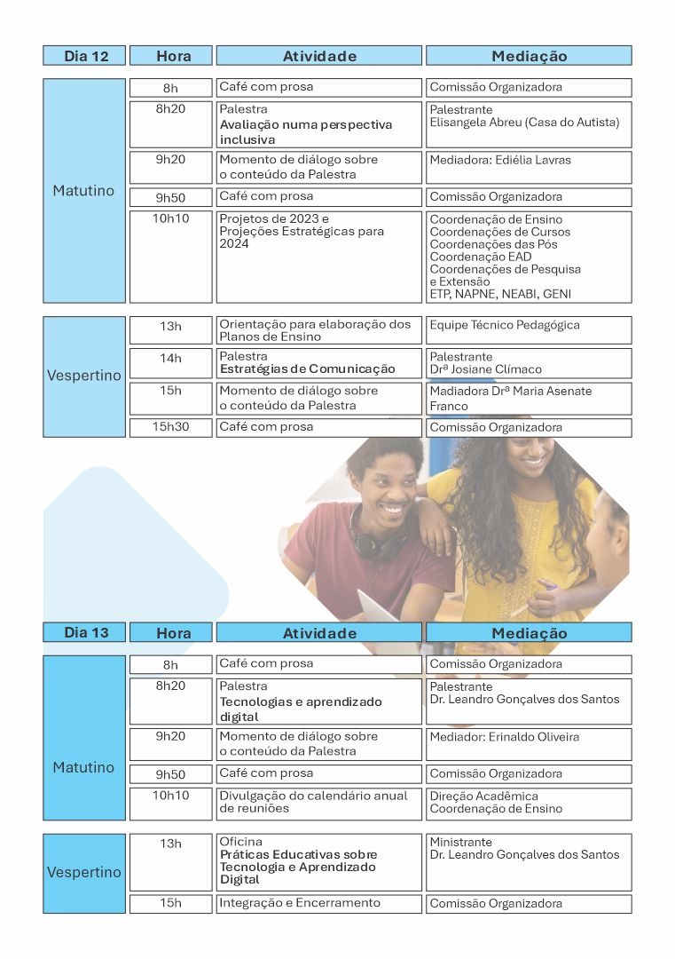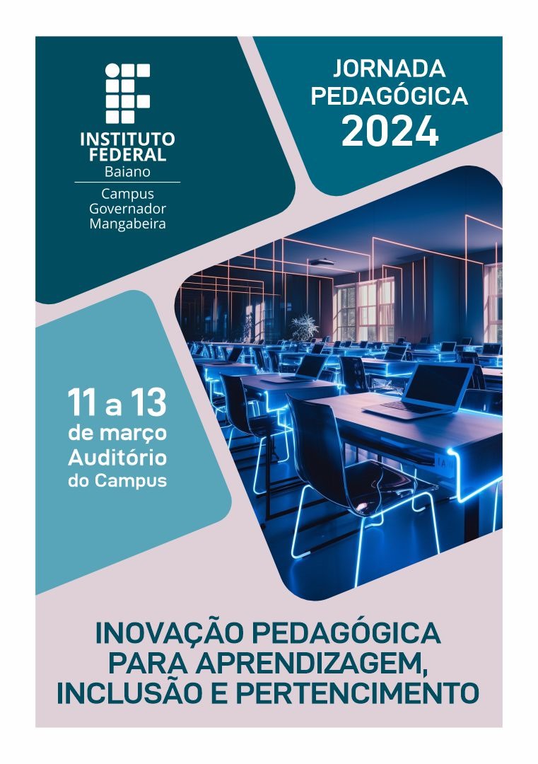 A jornada pedagógica 2024 será realizada nos dias 11, 12 e 13 de março, com a seguinte temática: Inovação Pedagógica para Aprendizagem, Inclusão e Pertencimento. O evento conta com uma programação que contempla temáticas do dia a dia em sala de aula, espaço para debate, avaliação e, especialmente, o planejamento do ano letivo. Será um momento enriquecedor para professores, técnicos administrativos e corpo gestor do nosso campus.