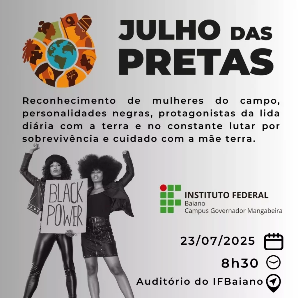 O Instituto Federal Baiano – Campus Governador Mangabeira convida toda a comunidade acadêmica para participar da ação Julho das Pretas, que será realizada no dia 23 de julho de 2025, às 8h30, no auditório do campus.