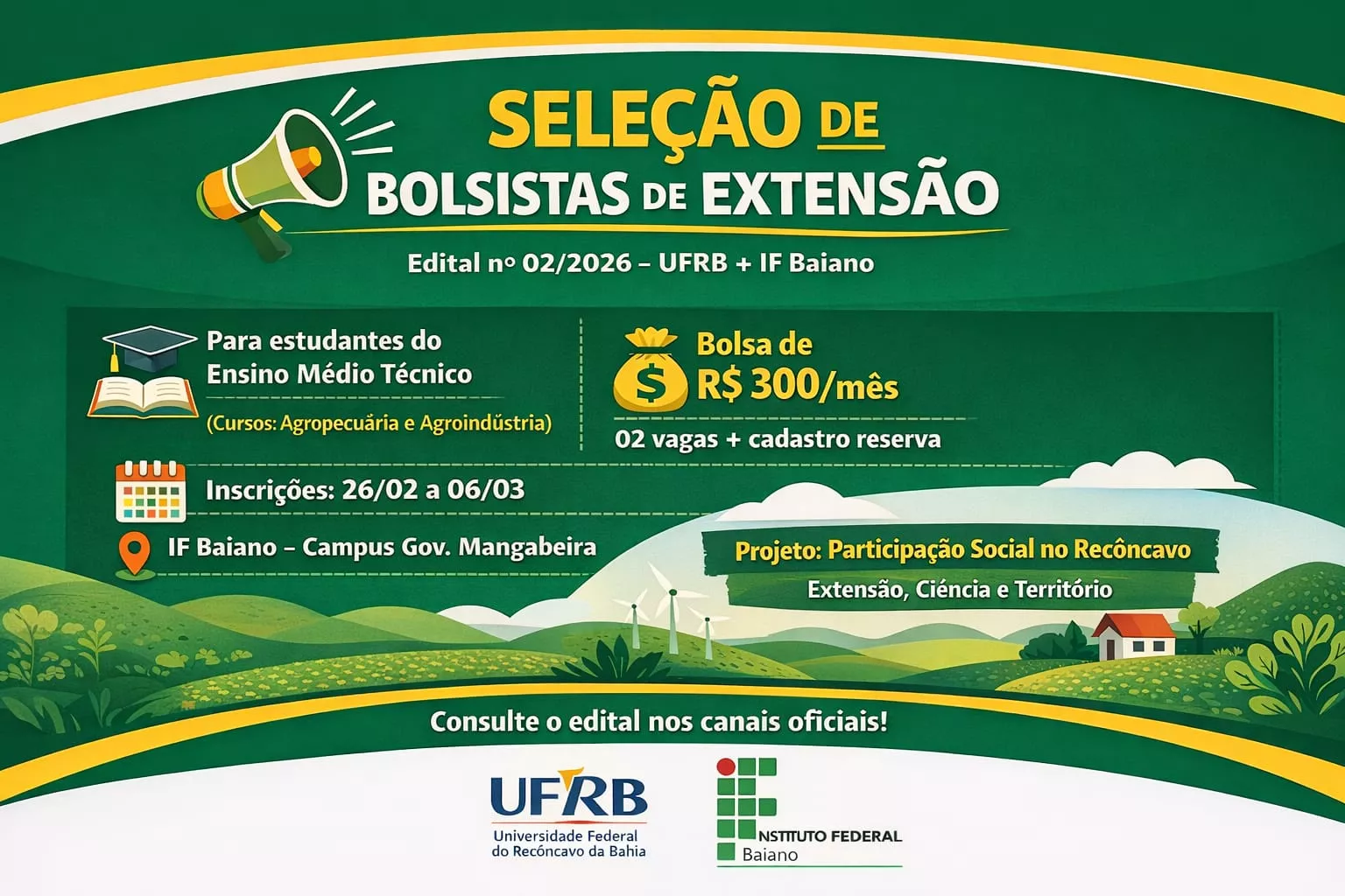 O Instituto Federal de Educação, Ciência e Tecnologia Baiano publicou o Edital de Prorrogação nº 32, de 25 de fevereiro de 2026, que prorroga até o dia 06 de março de 2026 o período de inscrições do Edital nº 18/2026, referente à seleção simplificada de estudantes para o Programa Nacional de Promoção de Igualdade de Oportunidades para Acesso de Estudantes da Rede Pública de Ensino à Rede Federal de Educação Profissional, Científica e Tecnológica – PartiuIF.