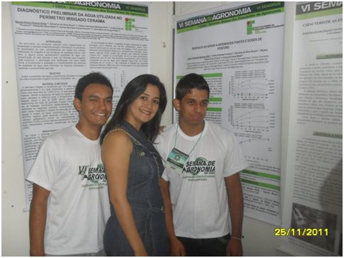 Apresentação de pôsteres pelos discentes (Esq.) Cleyton Fernando, Nayara Viana e Varley Almeida – IV Semestre