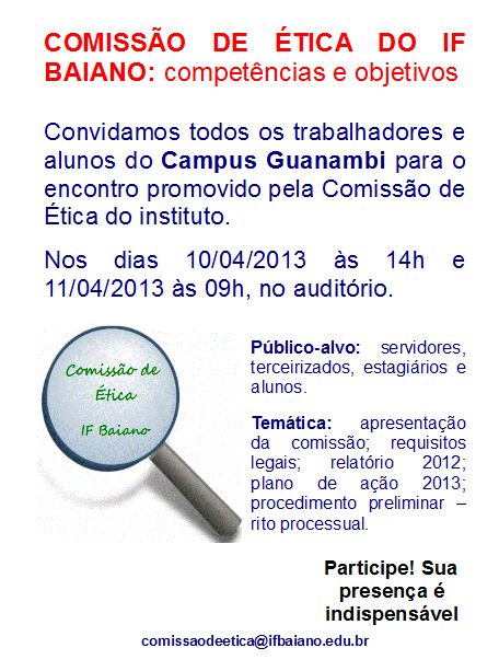 Convidamos todos os trabalhadores e alunos do Campus Guanambi para o encontro promovido pela Comissão de Ética do Instituto.