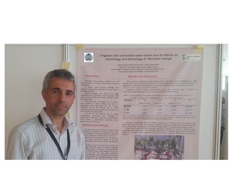 Os artigos “Irrigation with controlled water stress and its effects on physiology and phenology of ‘Navelate’ orange” e “Water availability effect on gas exchange and on phenology of ‘Cabula’ orangel” foram selecionados e fazem parte dos 18 trabalhos escolhidos de toda a América Latina. Do Brasil, apenas dois foram apresentados, sendo ambos do IFBaiano, da autoria do professor Cláudio Meira, frutos da pesquisa de pós-doutorado realizado na Universidade Federal de Pelotas – RS, sobre os efeitos do deficit hídrico na fisiologia e na fenologia de diferentes cultivares de citros.