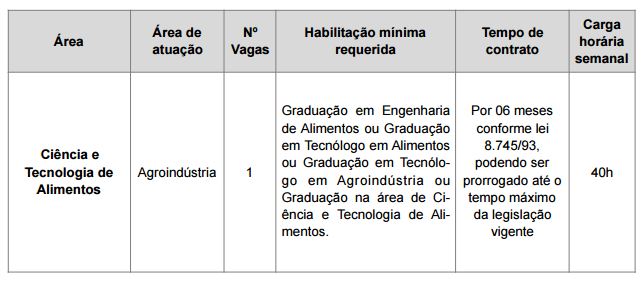 O Processo Seletivo será realizado em duas etapas, constituídas de Prova de Desempenho Didático (eliminatória e classificatória) e de Prova de Títulos (classificatória). O contrato de trabalho será de seis meses, podendo ser prorrogado dentro dos limites da legislação vigente. A remuneração pode chegar a R$ 5.601,41 dependendo da titulação. A carga horária é de 40 horas semanais.