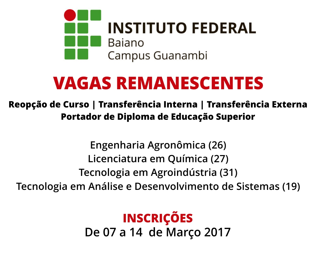 Estão abertas até o dia 14 de março de 2017, as inscrições para ingresso em Vagas Remanescentes do Instituto Federal Baiano Campus Guanambi. São 103 vagas distribuídas nos quatro cursos da instituição, Engenharia Agronômica (26), Licenciatura em Química (27), Tecnologia em Agroindústria (31) e Tecnologia em Análise e Desenvolvimento de Sistemas (19).