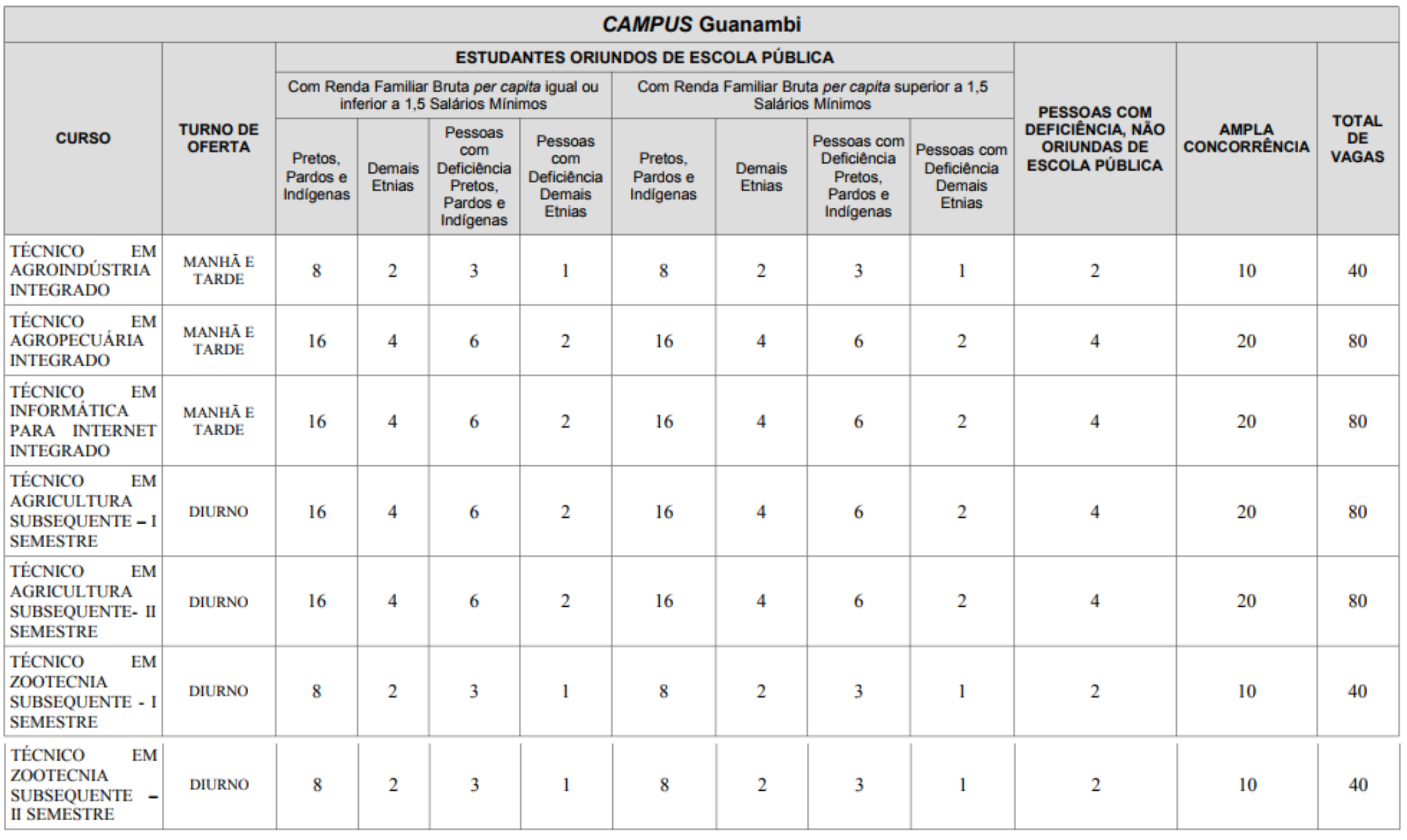 O Campus Guanambi oferta 440 vagas neste Processo Seletivo para os cursos integrados ao ensino médio e subsequentes, veja o quadro:
