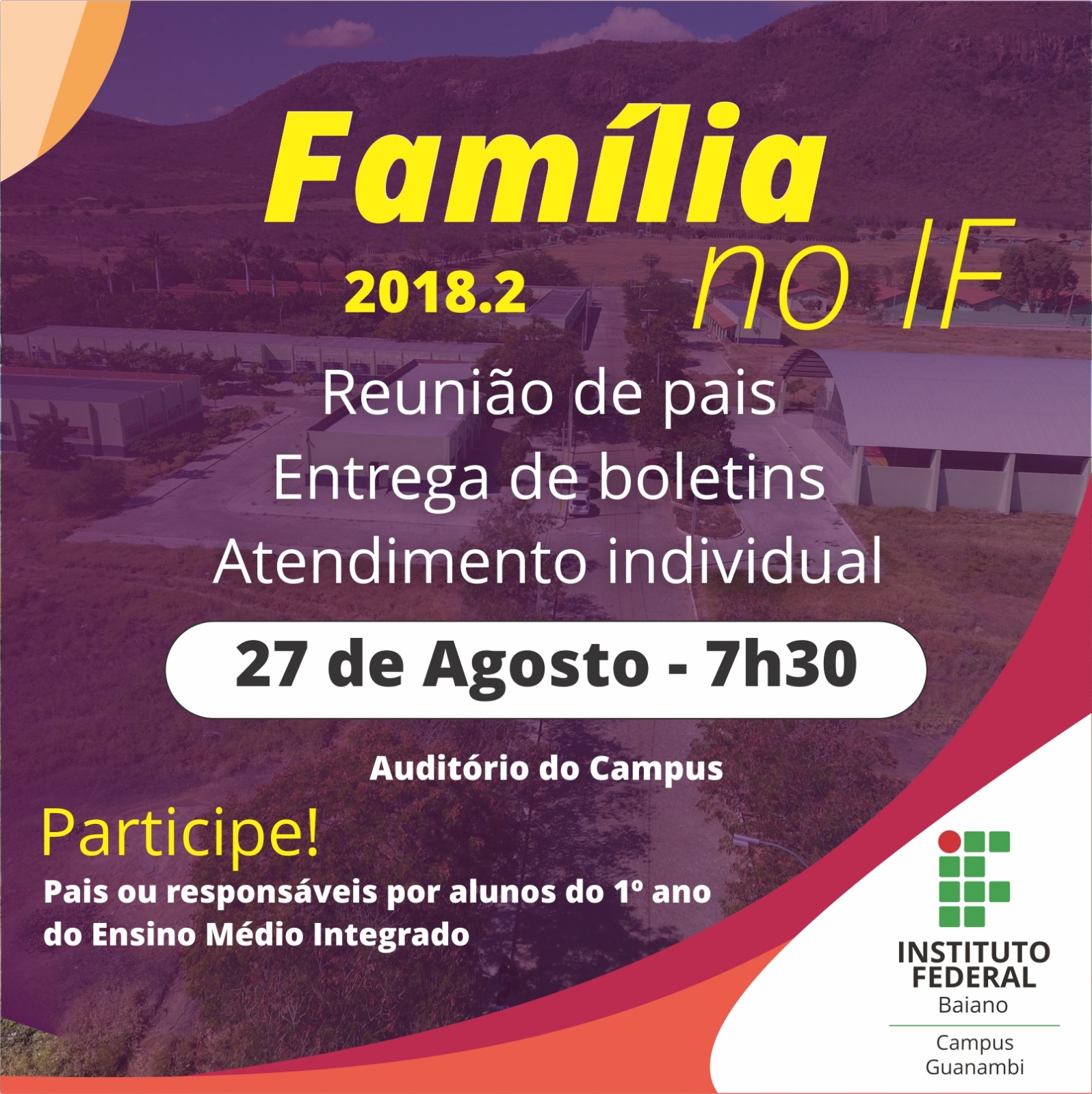 O Instituto Federal Baiano – Campus Guanambi realiza nesta segunda-feira (27), o “Família no IF”. Para a data, a instituição está convidando pais ou responsáveis pelos alunos do primeiro ano do ensino médio integrado.