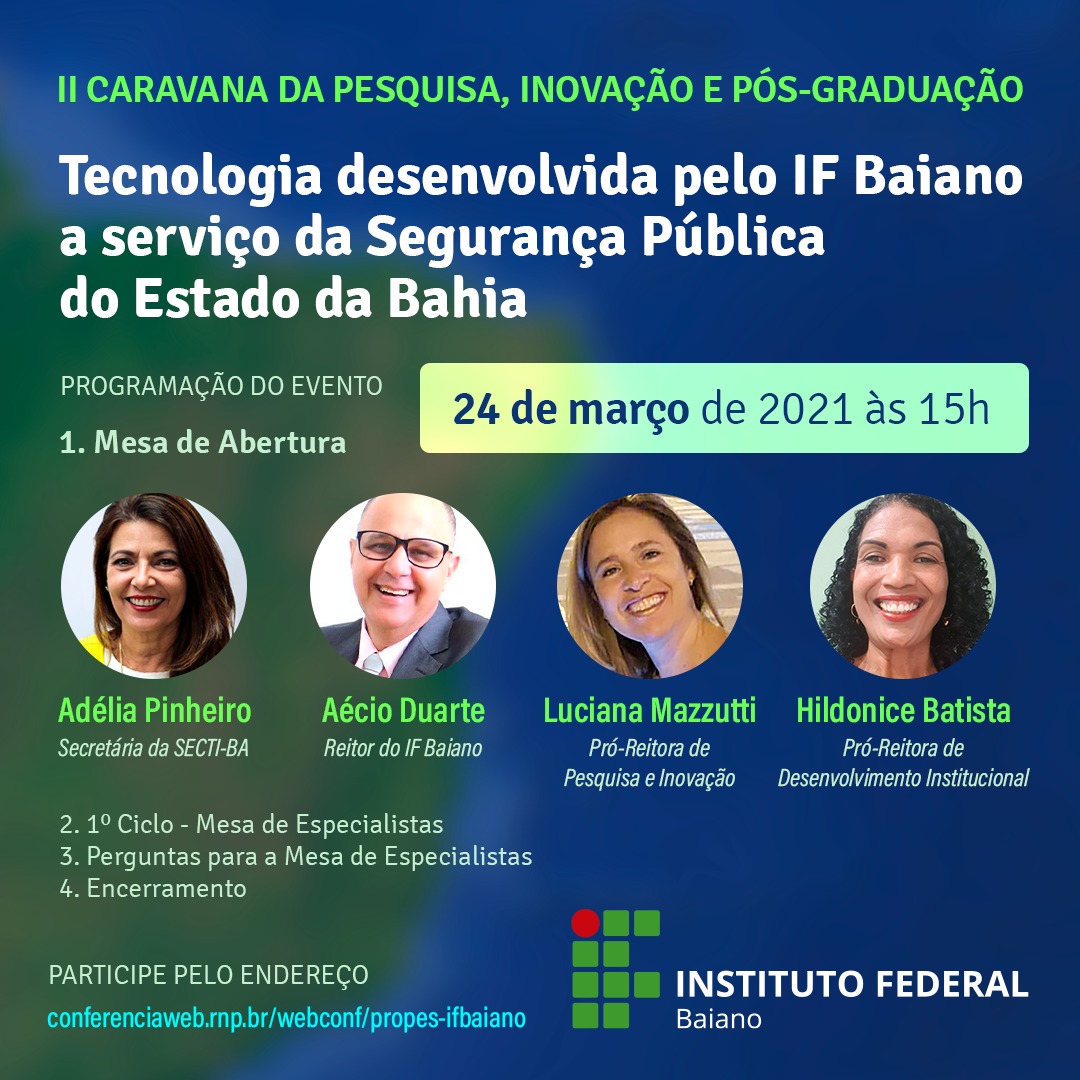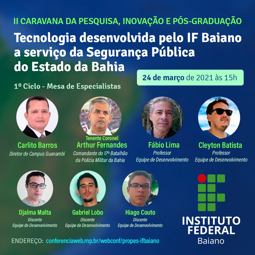 O IF Baiano retoma nesta quarta-feira, 24 de março, a Caravana da Pesquisa, Inovação e Pós-Graduação. A segunda edição do ciclo de palestras abrirá os trabalhos com o debate “Tecnologia desenvolvida pelo IF Baiano a serviço da Segurança Pública do Estado da Bahia”, que será on-line, transmitido pela plataforma RNP, através deste link, a partir das 15h.