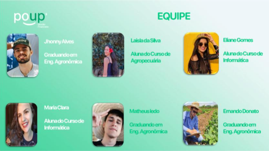 A equipe do desenvolvedora da proposta denominado “Poup – Gestão Financeira” foi formada pelos alunos Ernando Donato, Jhonny Alves, Matheus Ledo (7º Semestre de Engenharia Agronômica), Eliane Gomes, Maria Clara Lopes (2º Ano do Técnico em Informática) e Laisla Silva (3º Ano de Agropecuária). Além da 5ª posição geral, eles conquistaram ainda a 2ª colocação no Desafio Agro, com iniciativas voltar para o setor agropecuário.