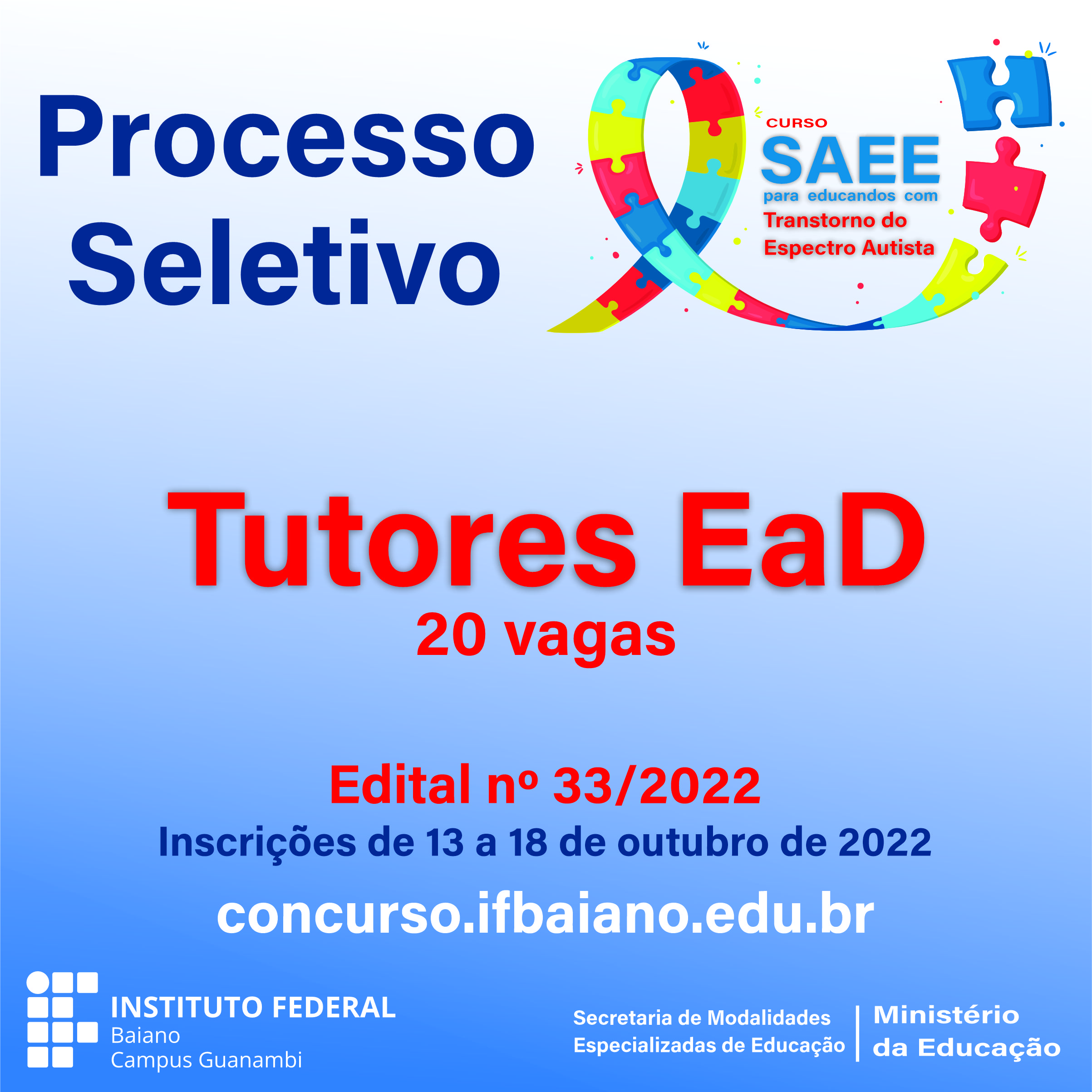 O Instituto Federal Baiano – Campus Guanambi está com dois editais abertos para contratação de tutores(as) EaD e pessoal de apoio administrativo. As contrações visam a realização do Curso de Formação Inicial e Continuada de Serviço de Atendimento Educacional Especializado para Educandos com Transtorno do Espectro Autista.