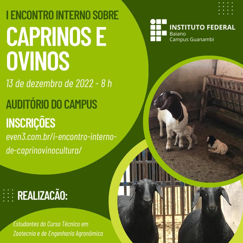 Nesta terça-feira (13), o Instituto Federal Baiano vai realizar o I Encontro Interno sobre Caprinos Ovinos. O evento será realizado no auditório do Campus Guanambi, a partir das 8h.