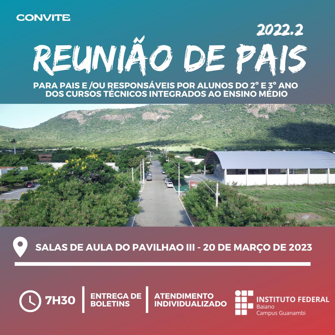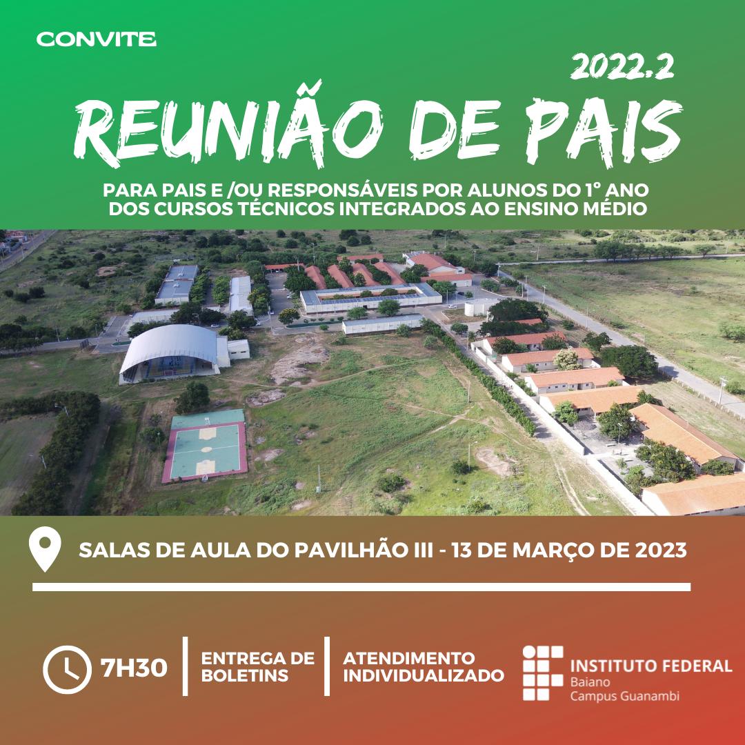 O Instituto Federal Baiano – Campus Guanambi está convidando os pais e mães (ou responsáveis) dos alunos dos cursos técnicos Integrados ao Ensino Médio para as reuniões com professores e coordenações.