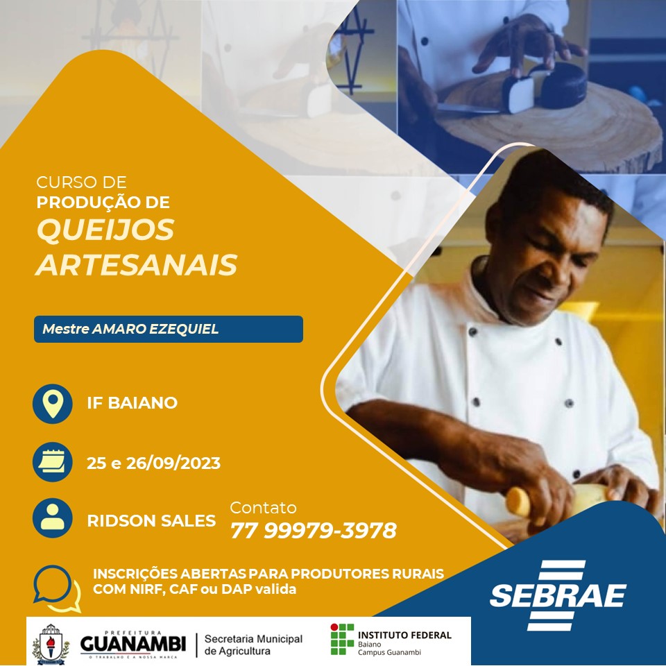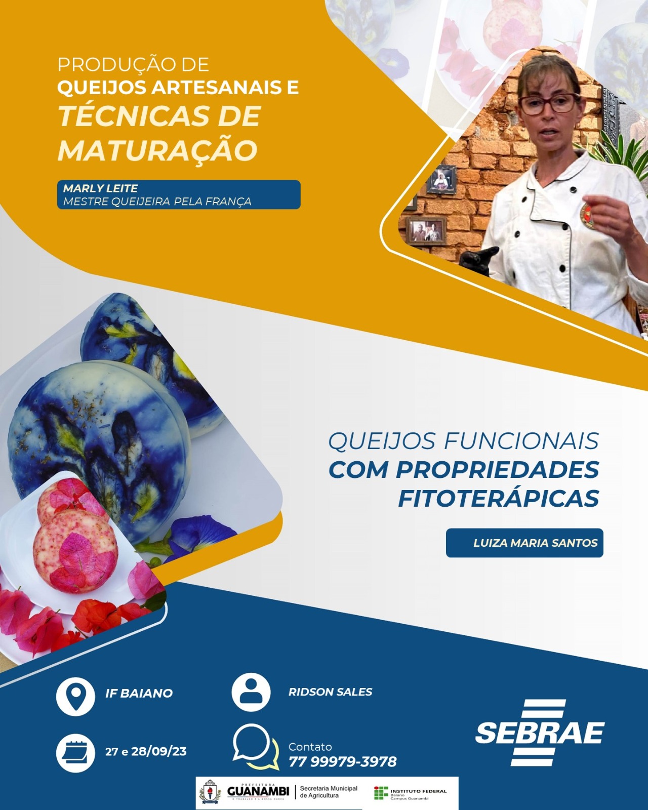 A produção de queijos artesanais é tema de capacitações promovidas pelo Sebrae e IF Baiano durante o mês de setembro em Guanambi. Serão dois cursos gratuitos, entre os dias 25 e 28, no campus do IF Baiano, localizado no distrito de Ceraíma. A ação conta com o apoio da Secretaria Municipal de Agricultura