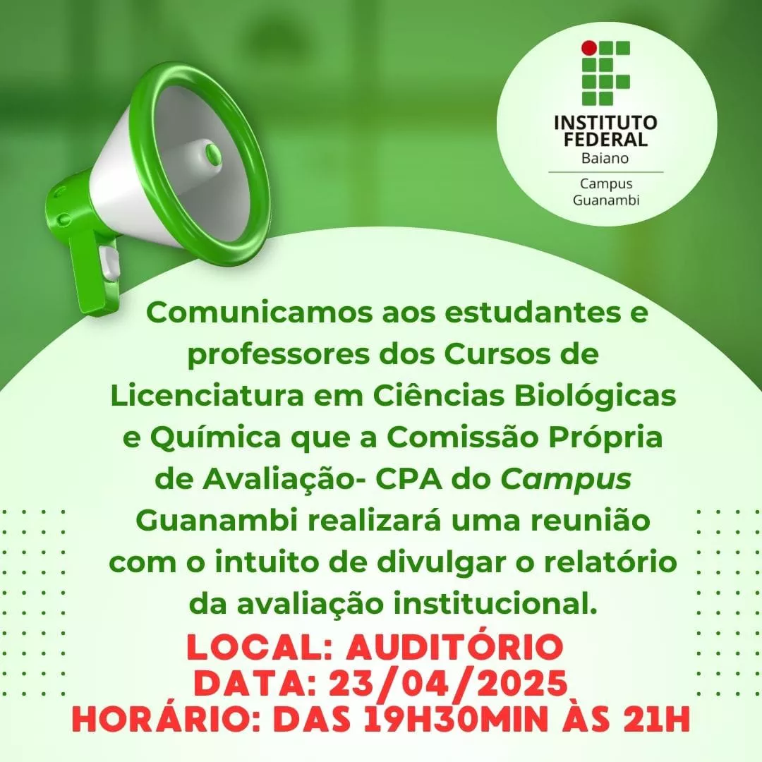 A Comissão Própria de Avaliação (CPA) do Campus Guanambi convida todos os estudantes e professores dos cursos de Licenciatura em Ciências Biológicas e Química para uma reunião de divulgação do Relatório de Avaliação Institucional.