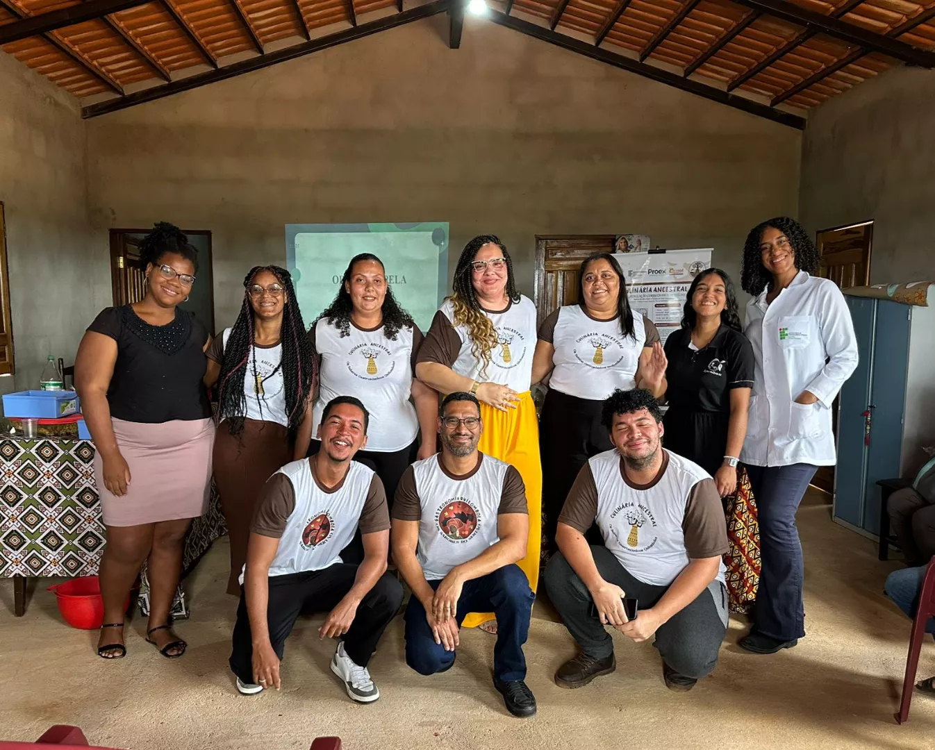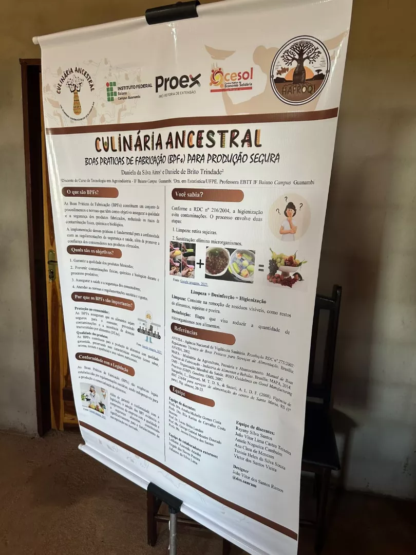 Nos dias 17 e 18 de maio de 2025, o projeto de extensão Culinária Ancestral: valorização, sustentabilidade e qualificação das cozinhas quilombolas no Território Sertão Produtivo realizou mais uma ação importante no território. Intitulada “Cozinhas Quilombolas em Ação: Formação em Boas Práticas de Fabricação”, a atividade foi realizada no Quilombo Lagoa dos Anjos, localizado na zona rural de Candiba (BA), e teve como foco a formação prática de moradores sobre segurança alimentar, higiene e valorização da culinária tradicional.