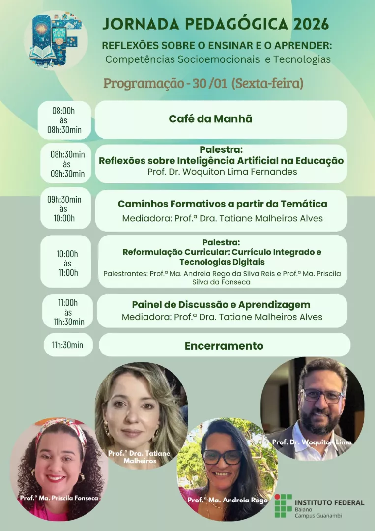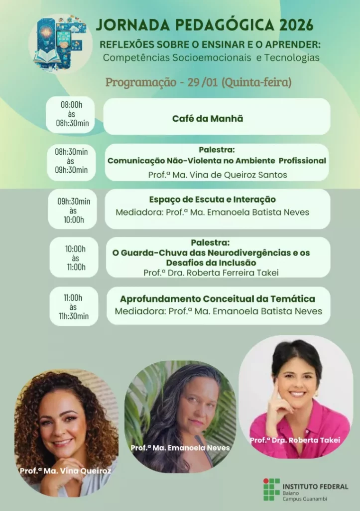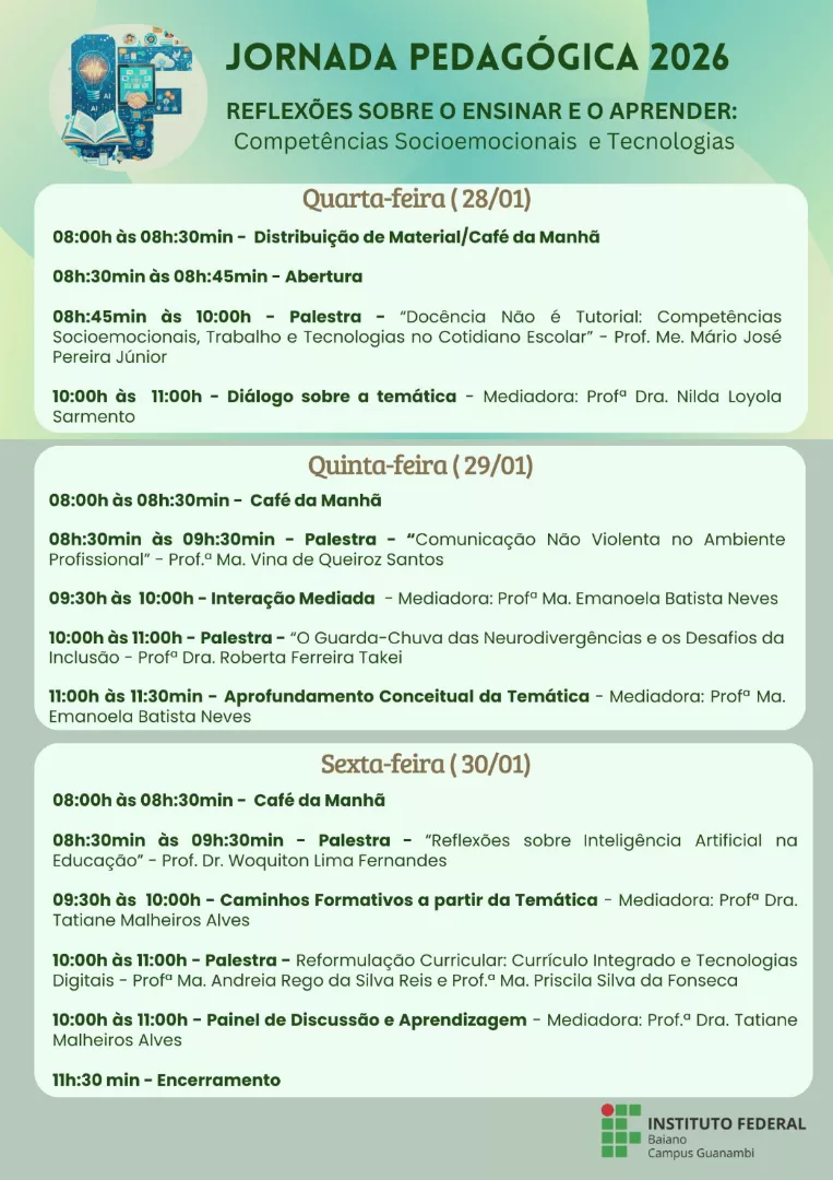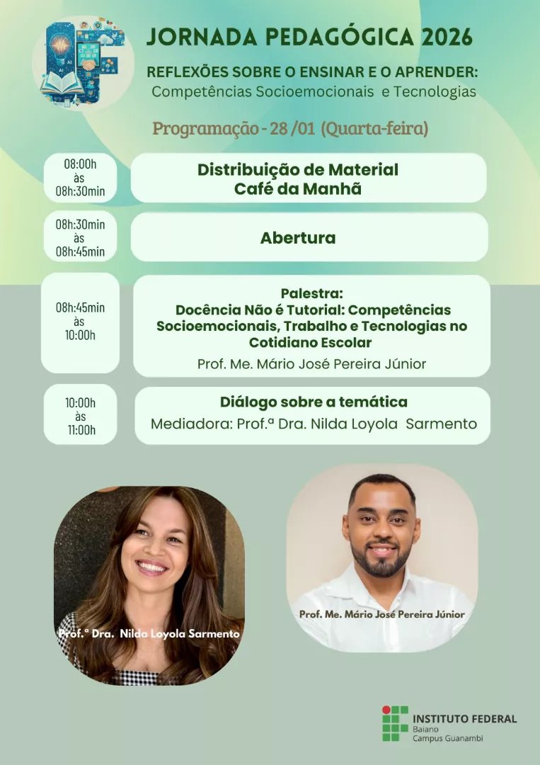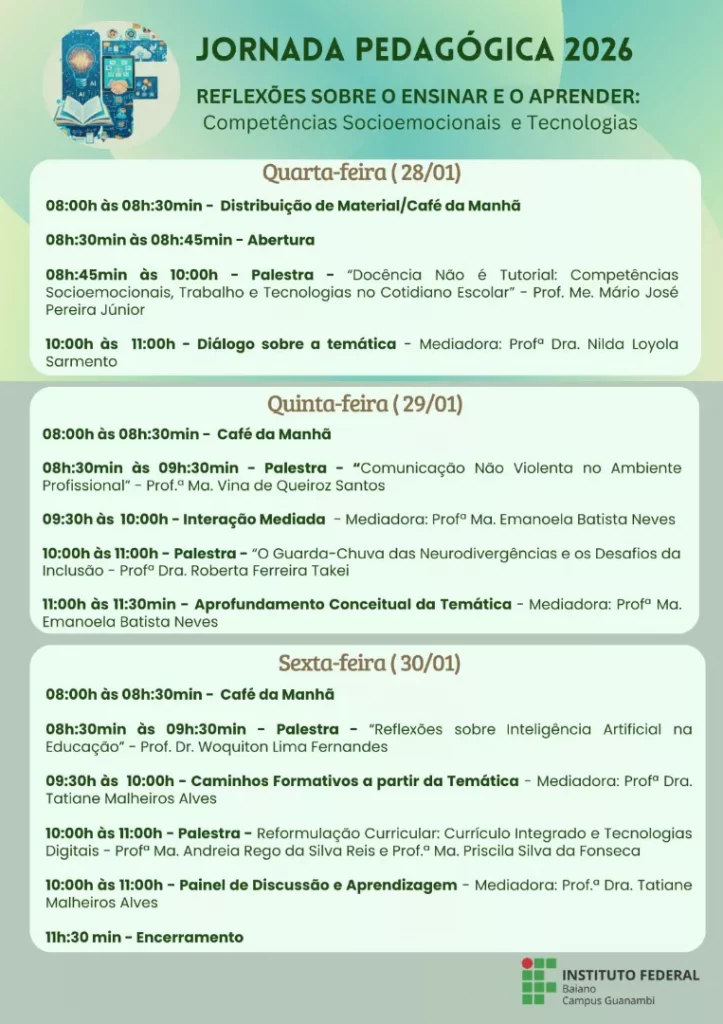 Com o tema “Reflexões sobre o Ensinar e o Aprender: Competências Socioemocionais e Tecnologias”, a Jornada Pedagógica do ano letivo de 2026 iniciou na manhã desta quarta-feira (28), no auditório do Instituto Federal Baiano – Campus Guanambi.